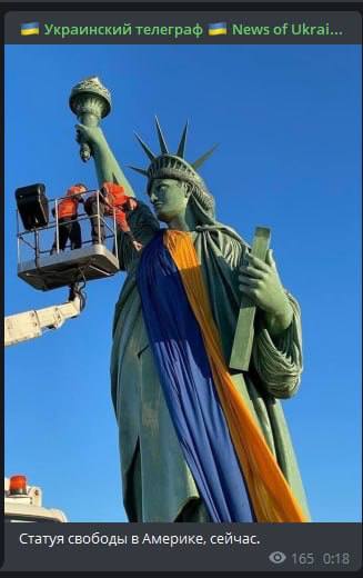 Фабула фейка. Статую Свободы в США «одели» в цвета украинского флага. Такие публикации распространяются в телеграм-каналах.