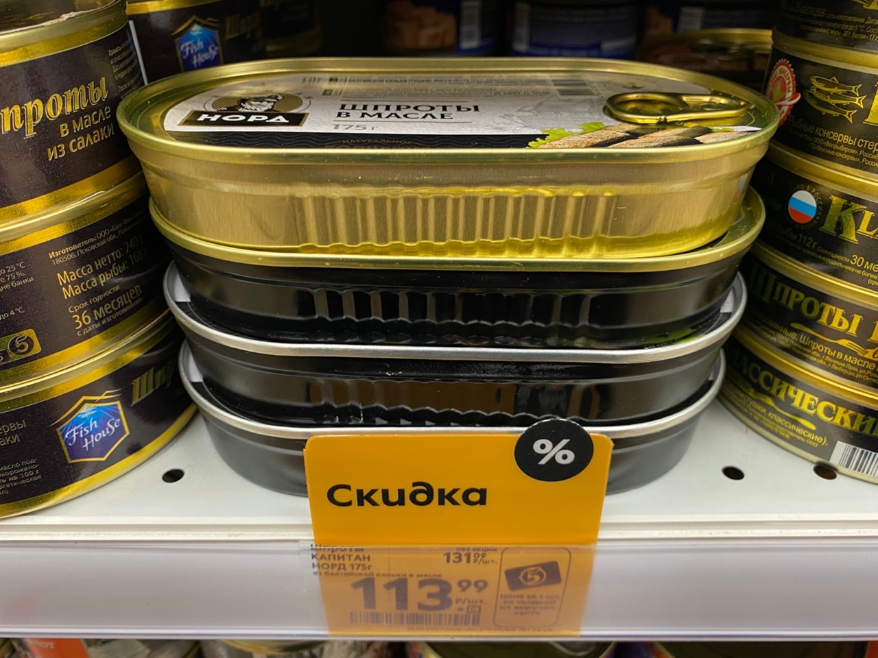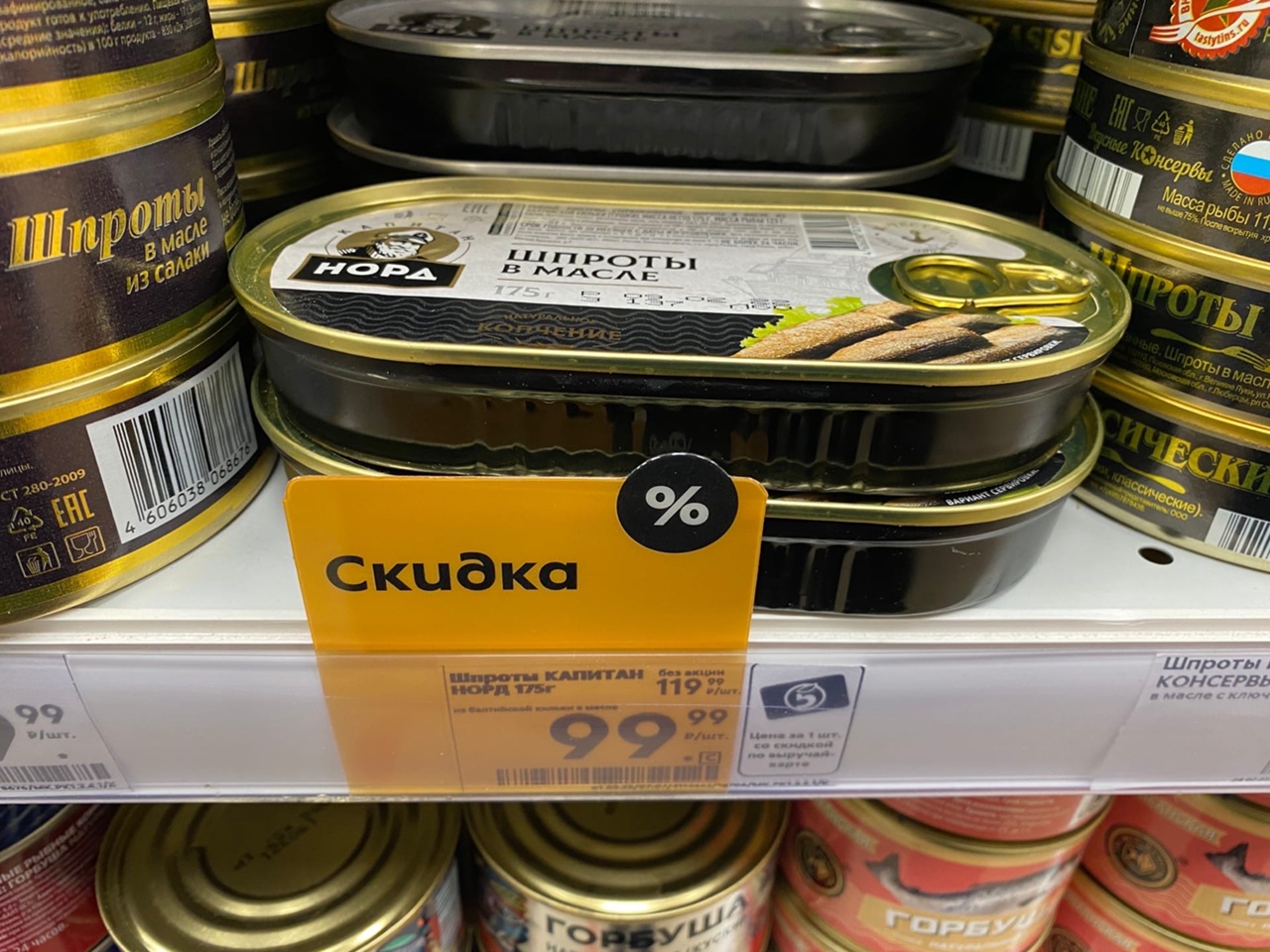 Ценник на рыбные консервы увеличился на 11 рублей. В процентном соотношении шпроты подорожали на 13,2%.