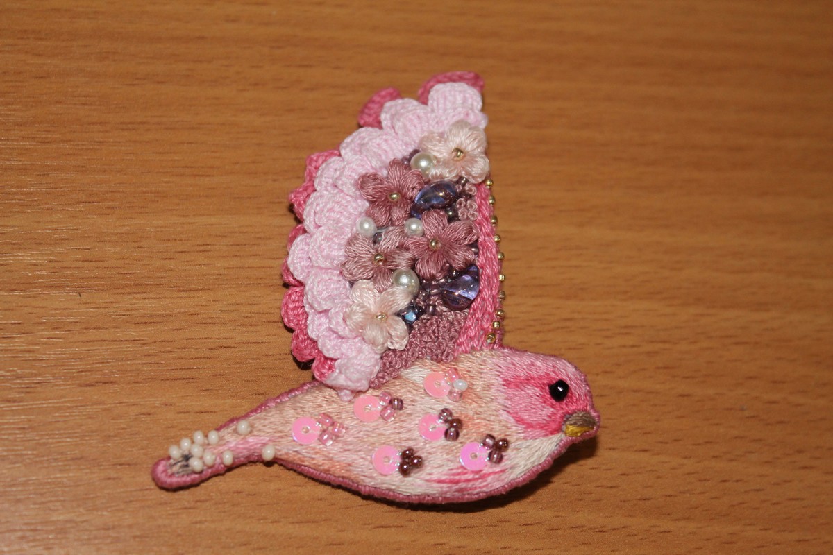 Так получились броши – птицы с цветочными узорами. Птицы все разные, есть и совы, и попугаи, и петухи.