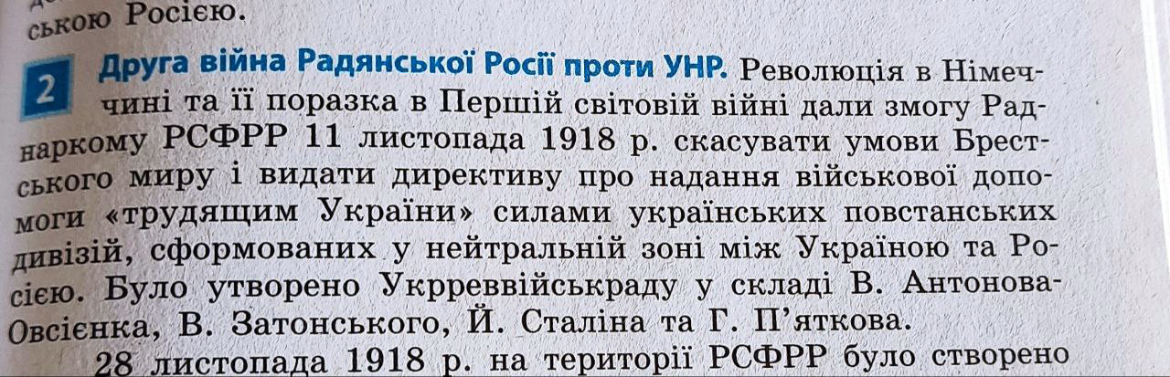 «Вторая война советской России против Украинской народной республики. Революция в Германии и поражение в Первой мировой войне дали возможность 11 ноября 1918 года уничтожить условия Брестского мира и издать директиву о приобретении военной помощи «Трудящимся Украины».
