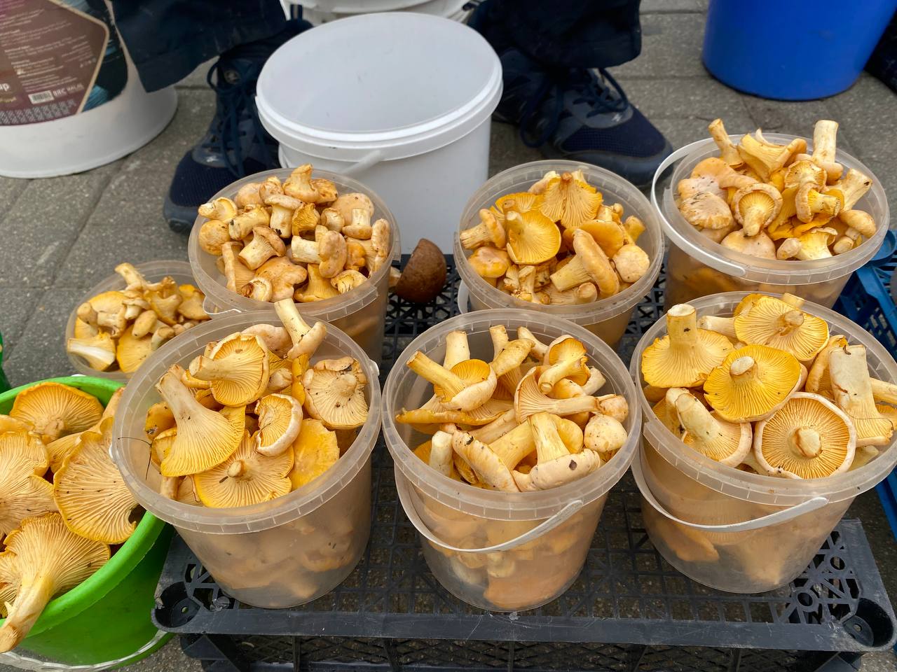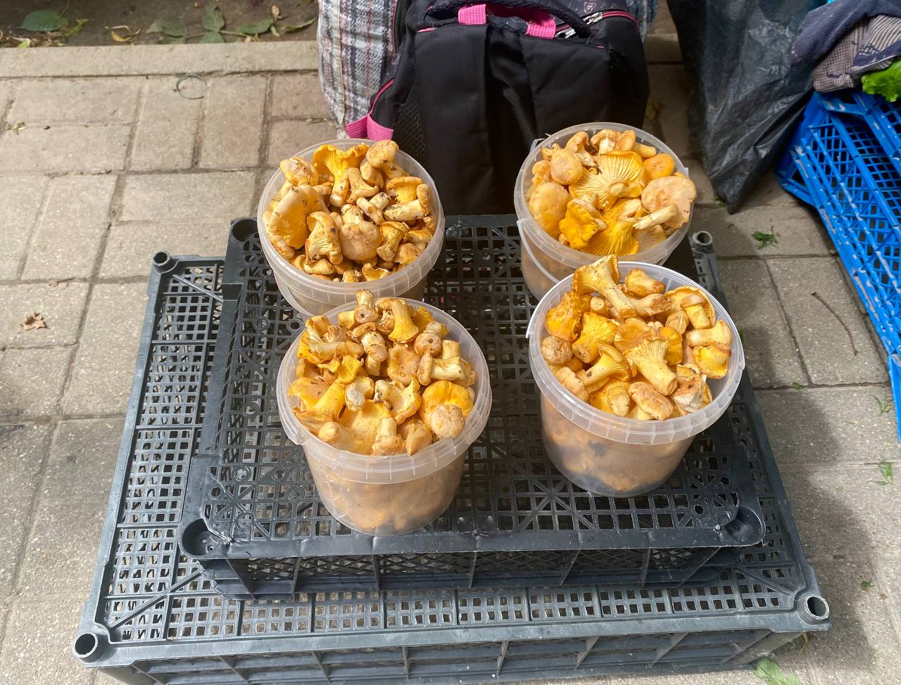 Цены везде примерно одинаковые: маленькое ведерко лисичек стоит от 150 до 200 рублей, среднее - 400, большое - 600.