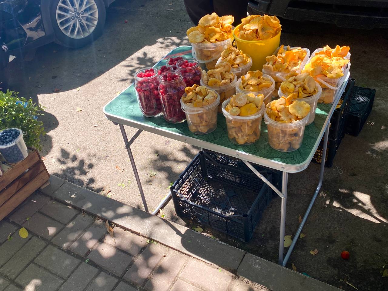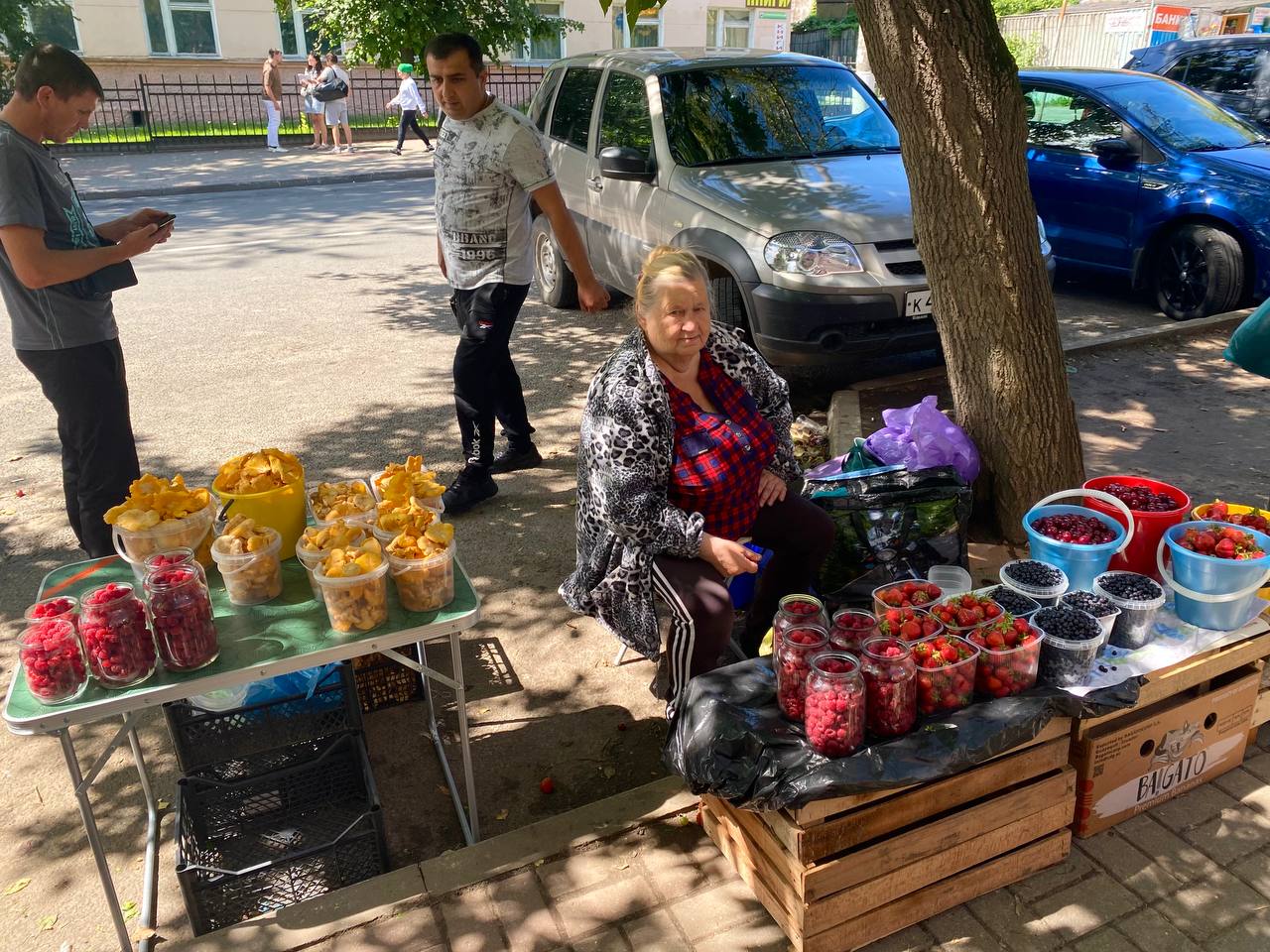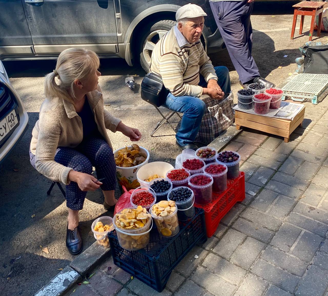 На улице Плеханова помимо овощей, ягод и цветов красуются яркие лисички. По словам продавщицы, эти грибы собирали в лесах Перемышльского района.