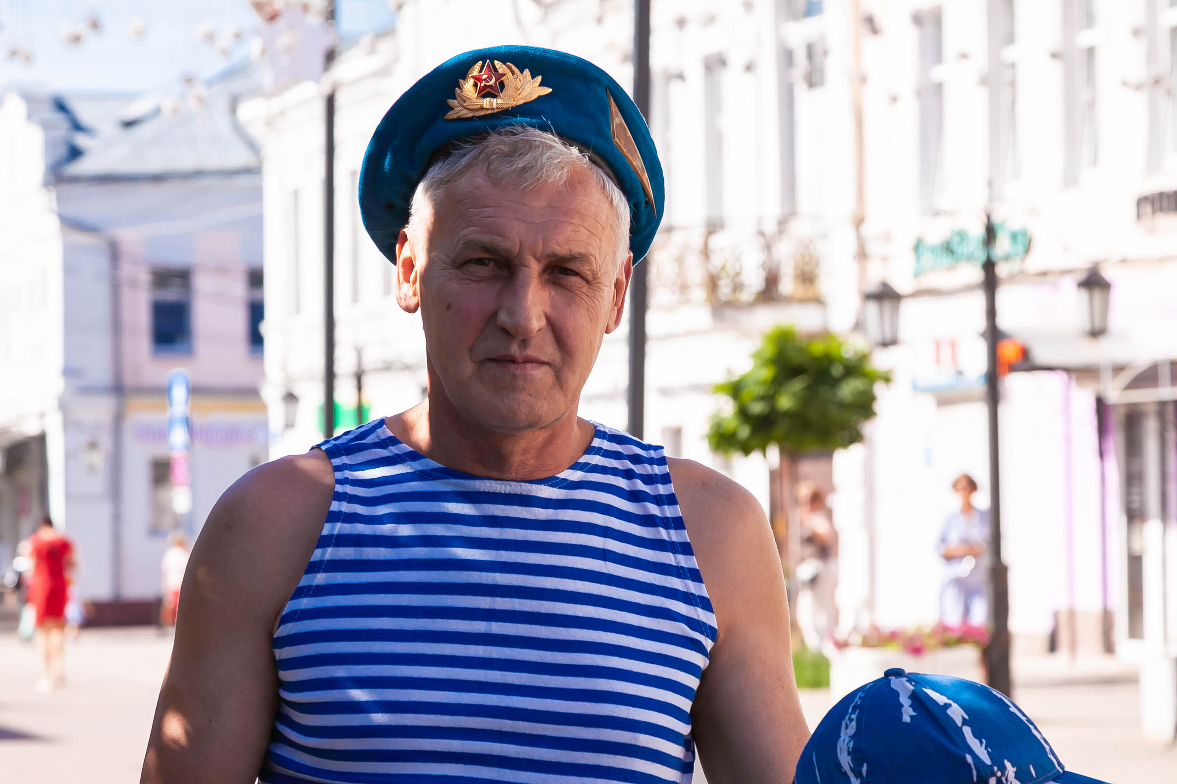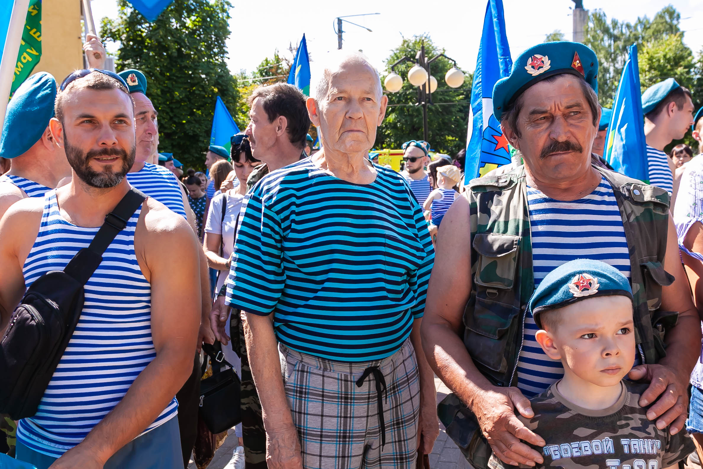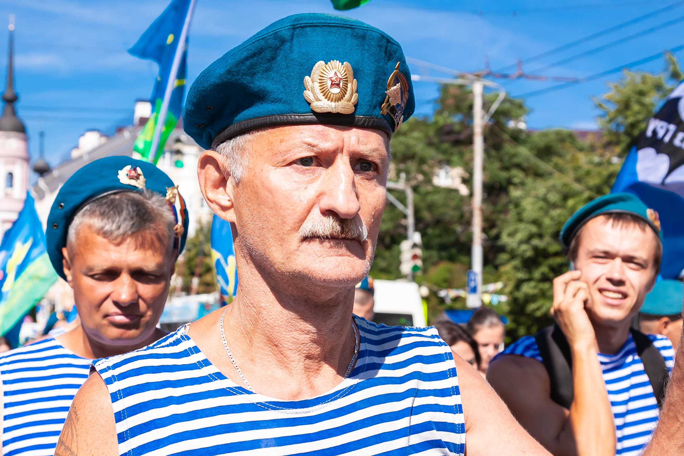 Колонна мужчин в тельняшках и голубых беретах проследовала до площади Победы.