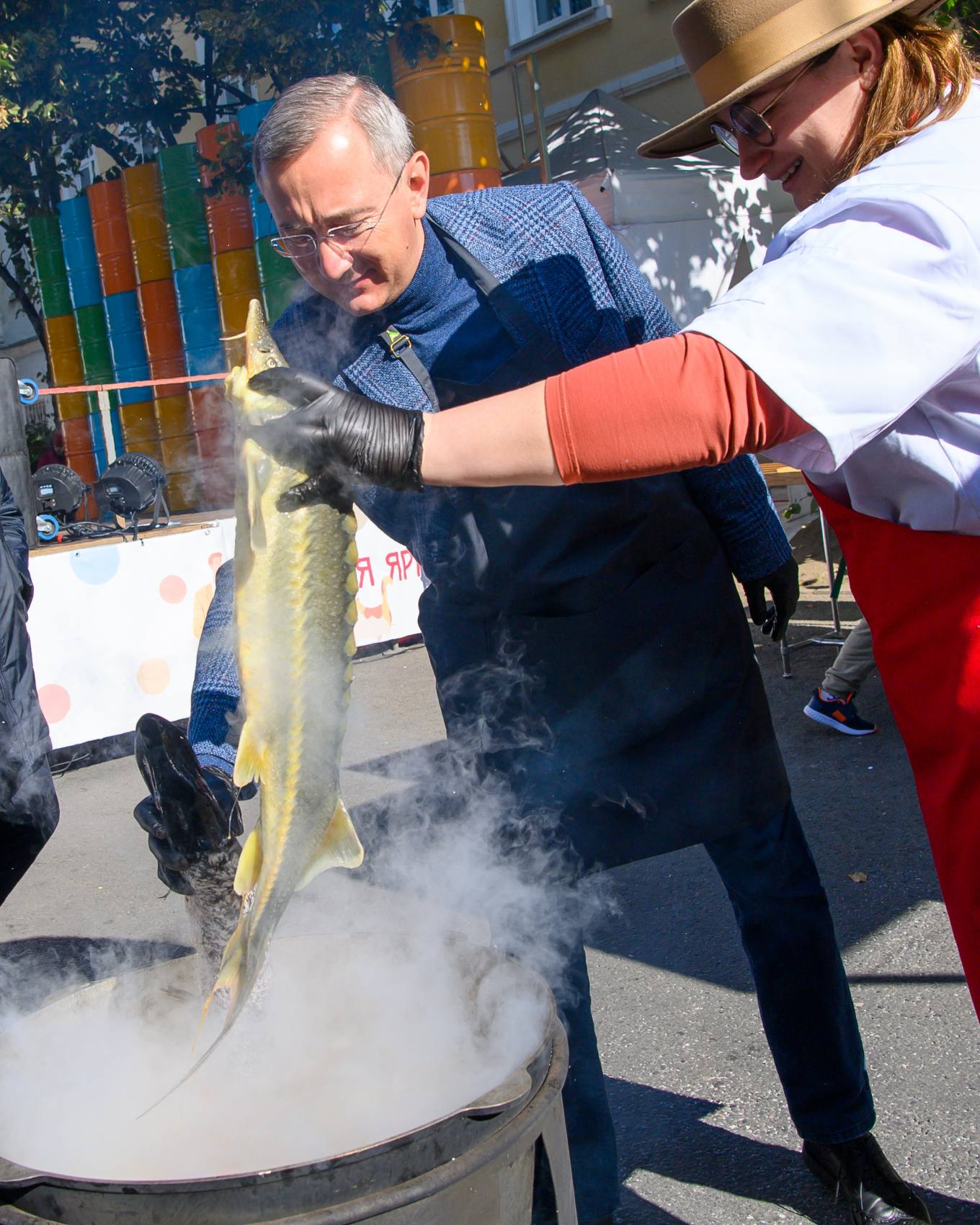 Губернатор Калужской области Владислав Шапша вместе с гастроэкспертом из Смоленска Натали Космачёвой в первые часы фестиваля приготовил уху по-гагарински.
