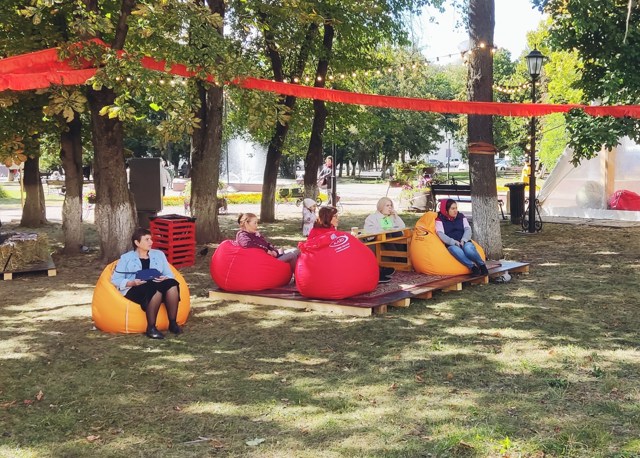 Гости фестиваля расположились в тени деревьев.