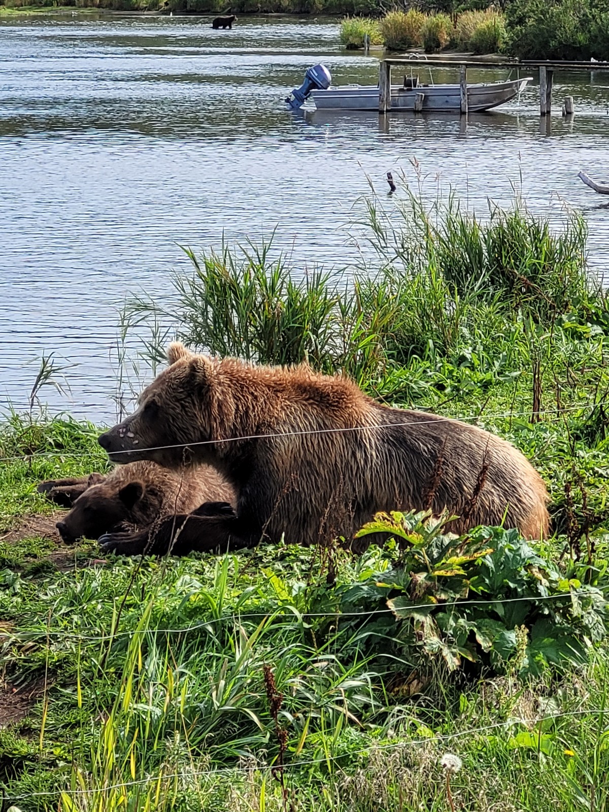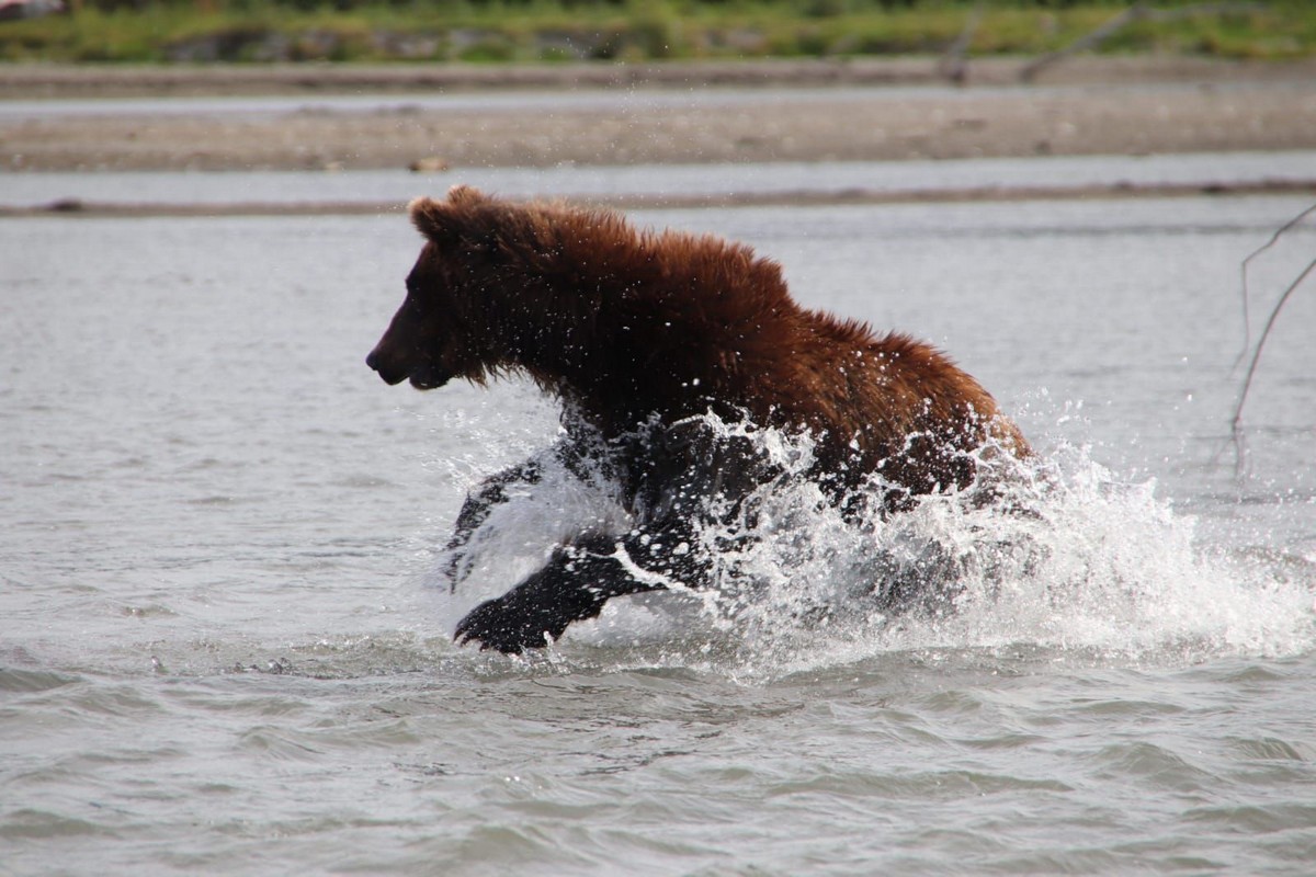 Мы садились на моторки, нас катали по озеру, а рядом плавали медведи. Они, то уплывали от нас, то подплывали, ныряли за рыбой. Потом на мостике, где запрудина, мы наблюдали, как медведи добывают себе еду.