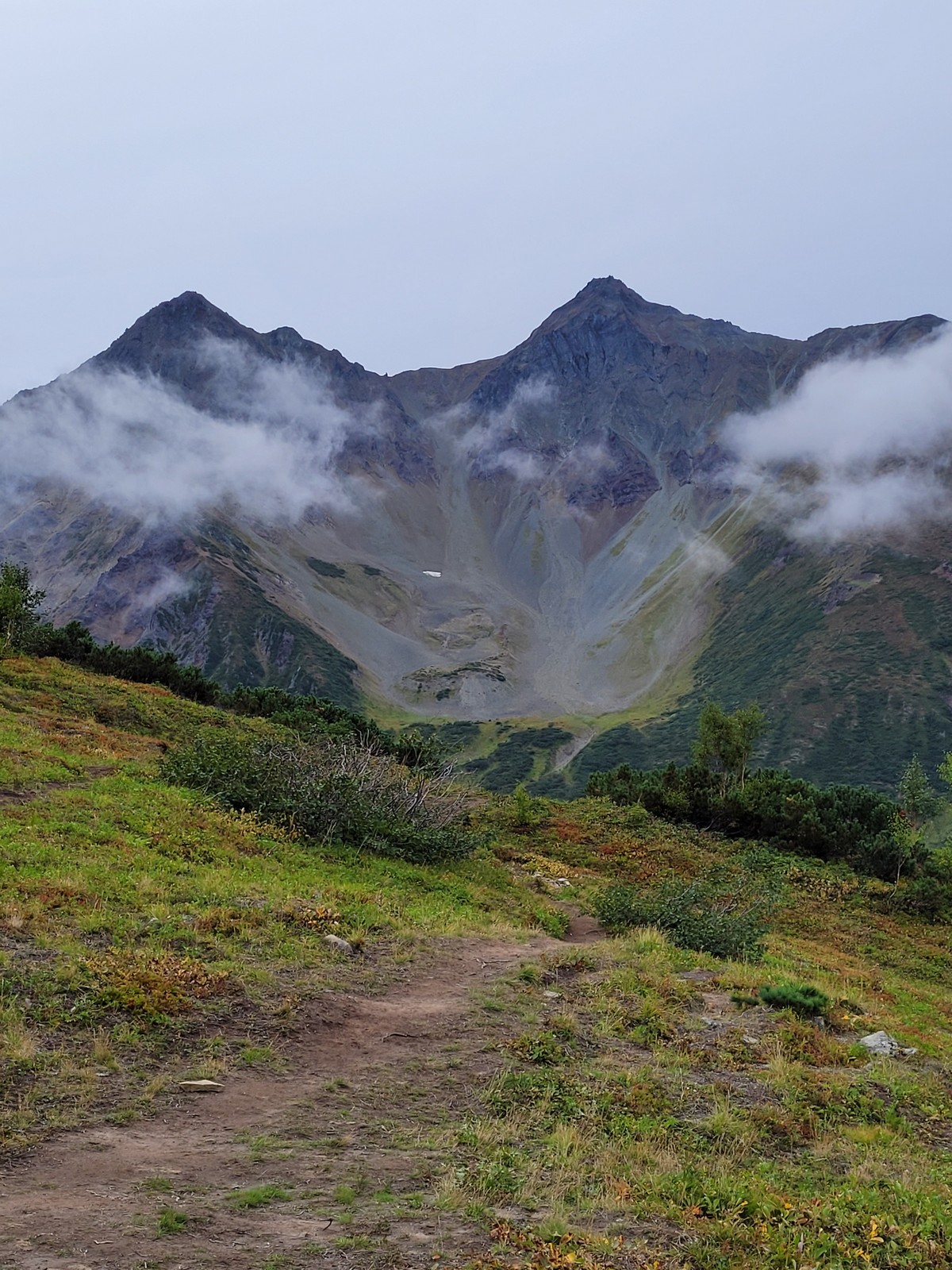 - Ещё у нас был подъём на вулкан Горелый. И была другая погода: солнце, тепло, безветренно. Тропинка там одна довольно крутая, ходит много групп. Все идут вверх - вниз, уважительно уступая дорогу, здороваются и спрашивают: