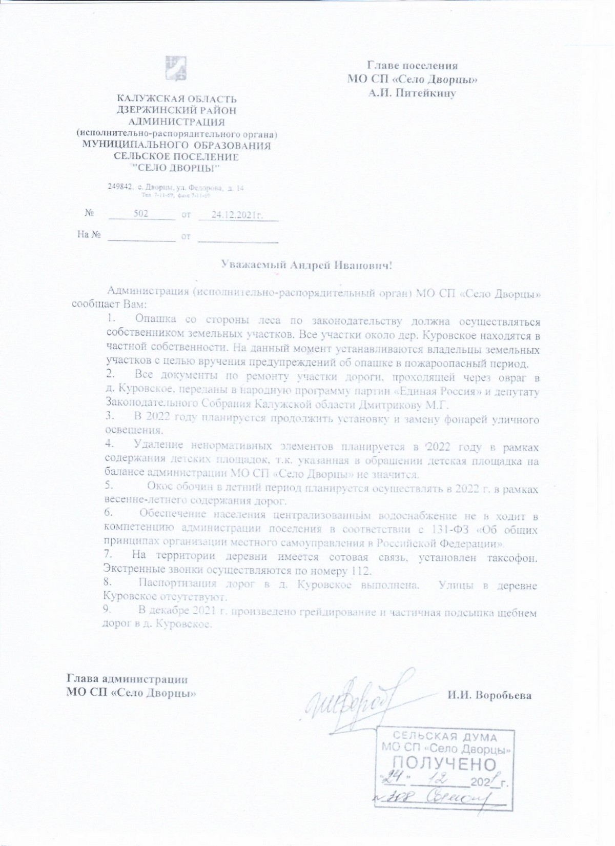 Там активно поднимается вопрос строительства дороги. Обращались жители и к депутатам, и к главе администрации СП «Дворцы» Ирине Воробьёвой, писали письма в прокуратуру, в администрацию Дзержинского района, в областную администрацию. Обивали пороги чиновников. Но получали всегда один ответ: денег нет.