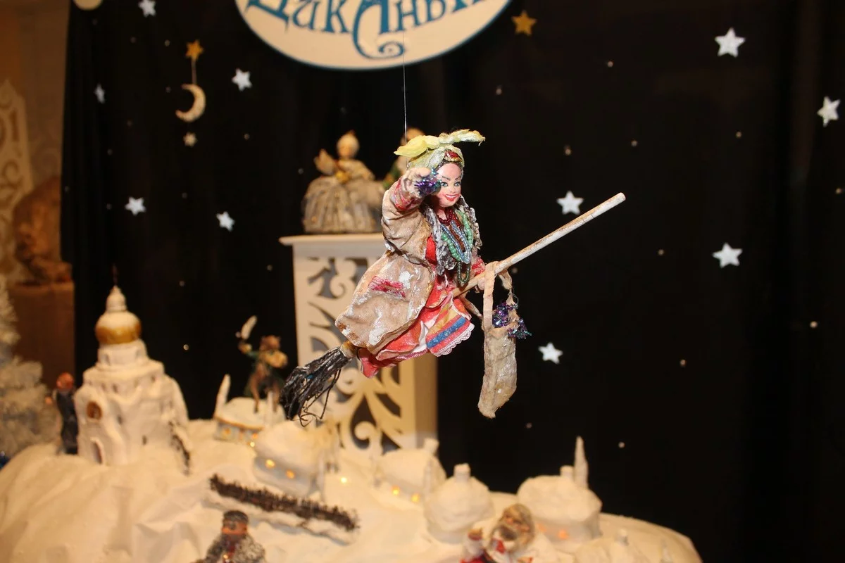 Из обычной ваты и клея Инесса Чудовская сотворила героев гоголевской Диканьки. Уже сейчас здесь наступила ночь перед Рождеством. В домиках горит свет, на метле летит Солоха, Викула дарит Оксане черевички, а по деревне ходят ряженые. Ой, а кто-то в снегу из мешка вылезает…