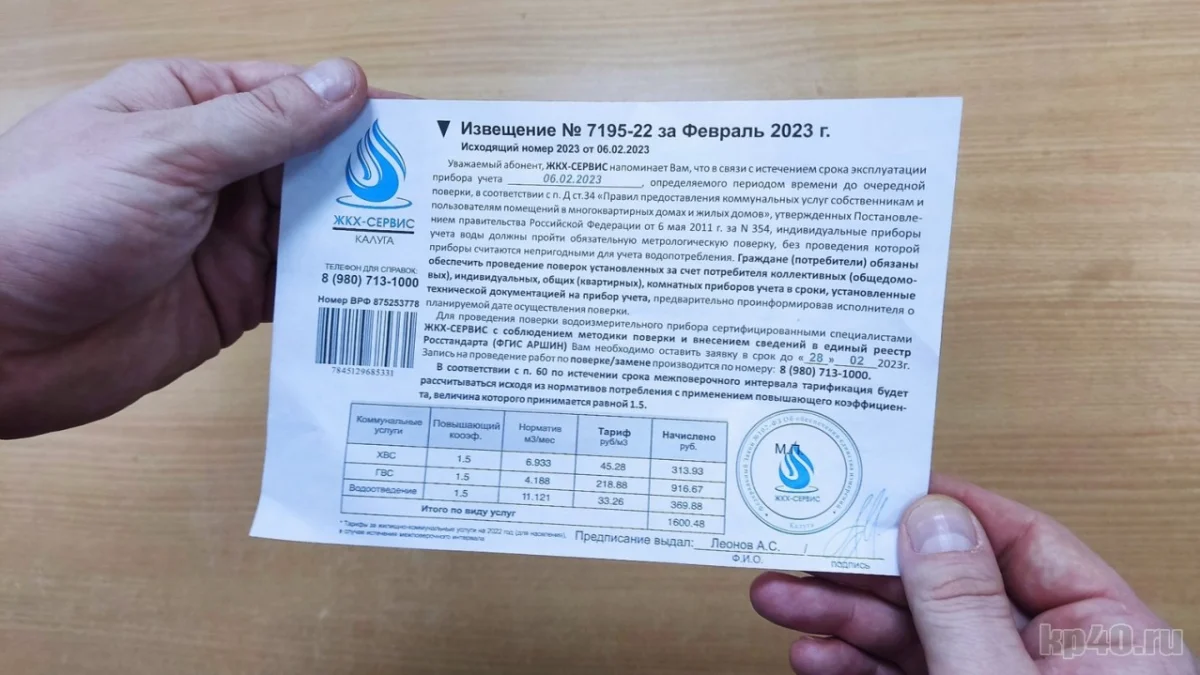 - 20.01.2023 Калужским УФАС России возбуждено дело по признакам нарушения законодательства о рекламе по факту распространения жителям города Калуги и Калужской области листовок-извещений об обязательной поверке приборов учета водоснабжения, - говорится в новости на сайте калужского УФАС. - Листовки оформлены с использованием элементов, сходных с элементами, применяемыми при оформлении извещений/ квитанций жилищно-коммунальными службами, а именно: с изображением штрих-кода, ссылки на нормативно-правовые акты, обращением к плательщикам, расчётной таблицы платы за коммунальную услугу с применением нормативов, аналогичной размещаемой в квитанциях коммунальными службами, печати.