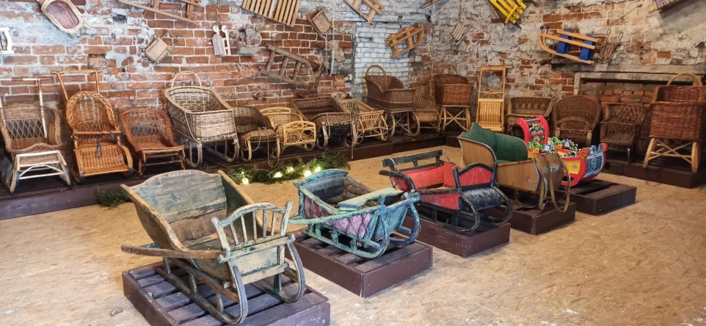 Сразу при входе в амбар на полу гостей встречают детские салазки, среди них много люлек, особенно, плетеных. А на стенах развешаны маленькие кукольные образцы.