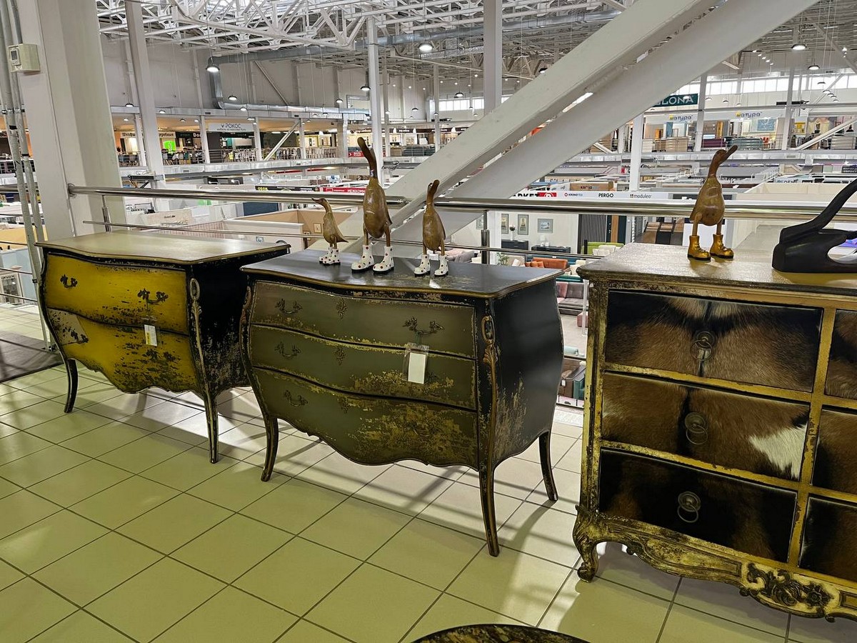 На втором этаже ТЦ привлекали внимание необычные комоды, в том числе обитые козьей шкурой. На них были поставлены декоративные деревянные уточки в забавных, не по размеру больших, деревянных башмаках.