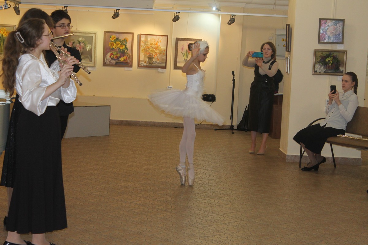 Выставка открылась под флейту и нежную хореографию в исполнении Анны Цомбаловой.