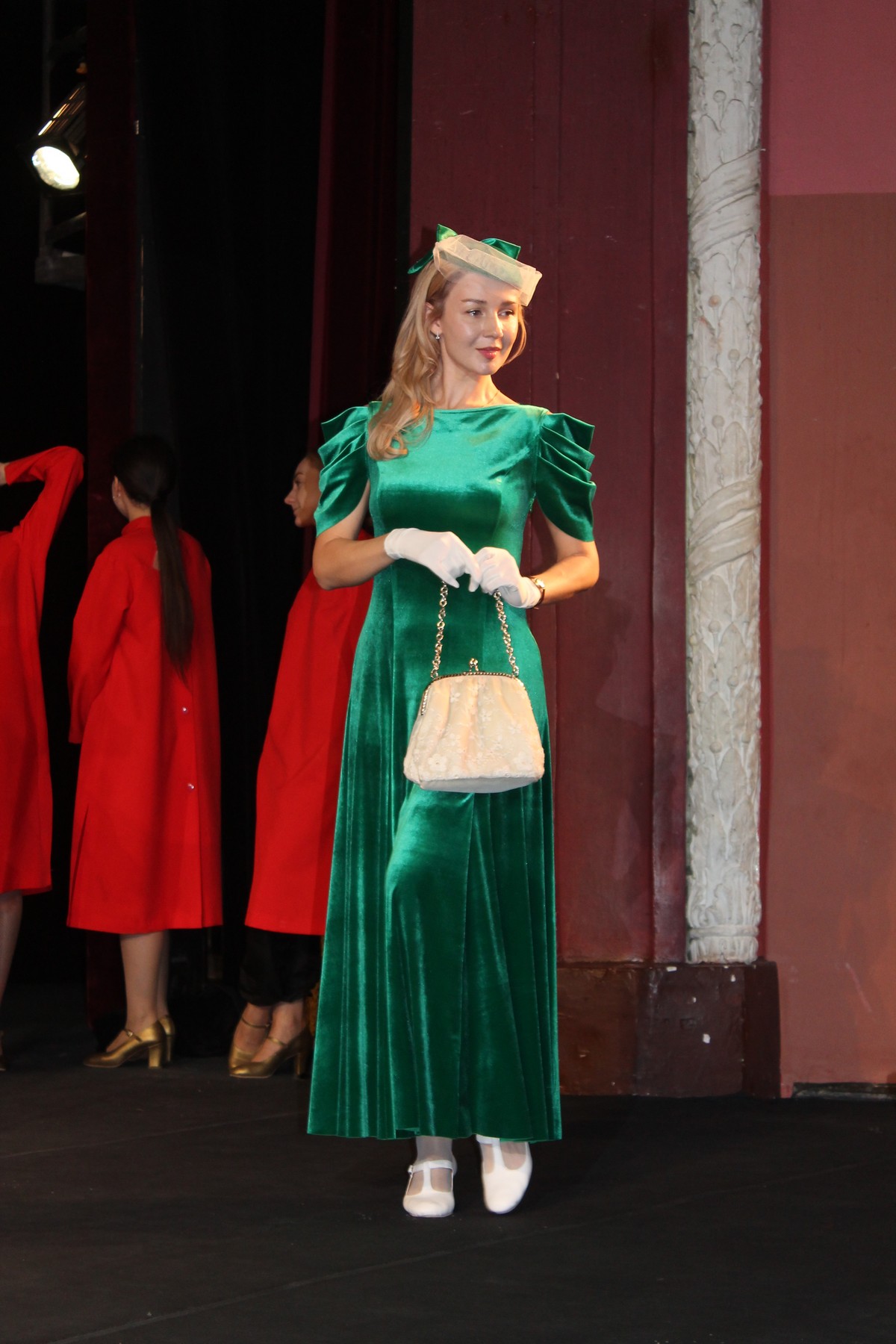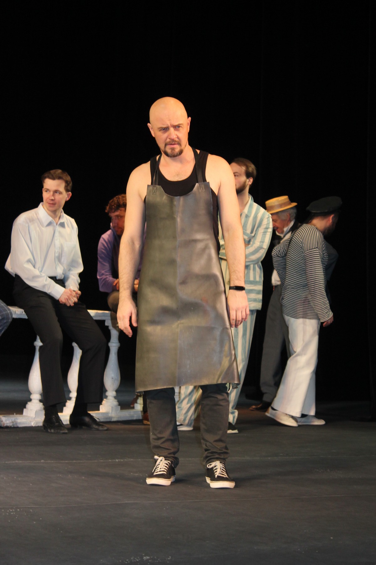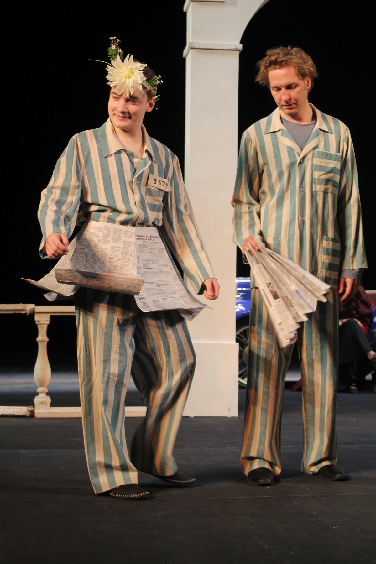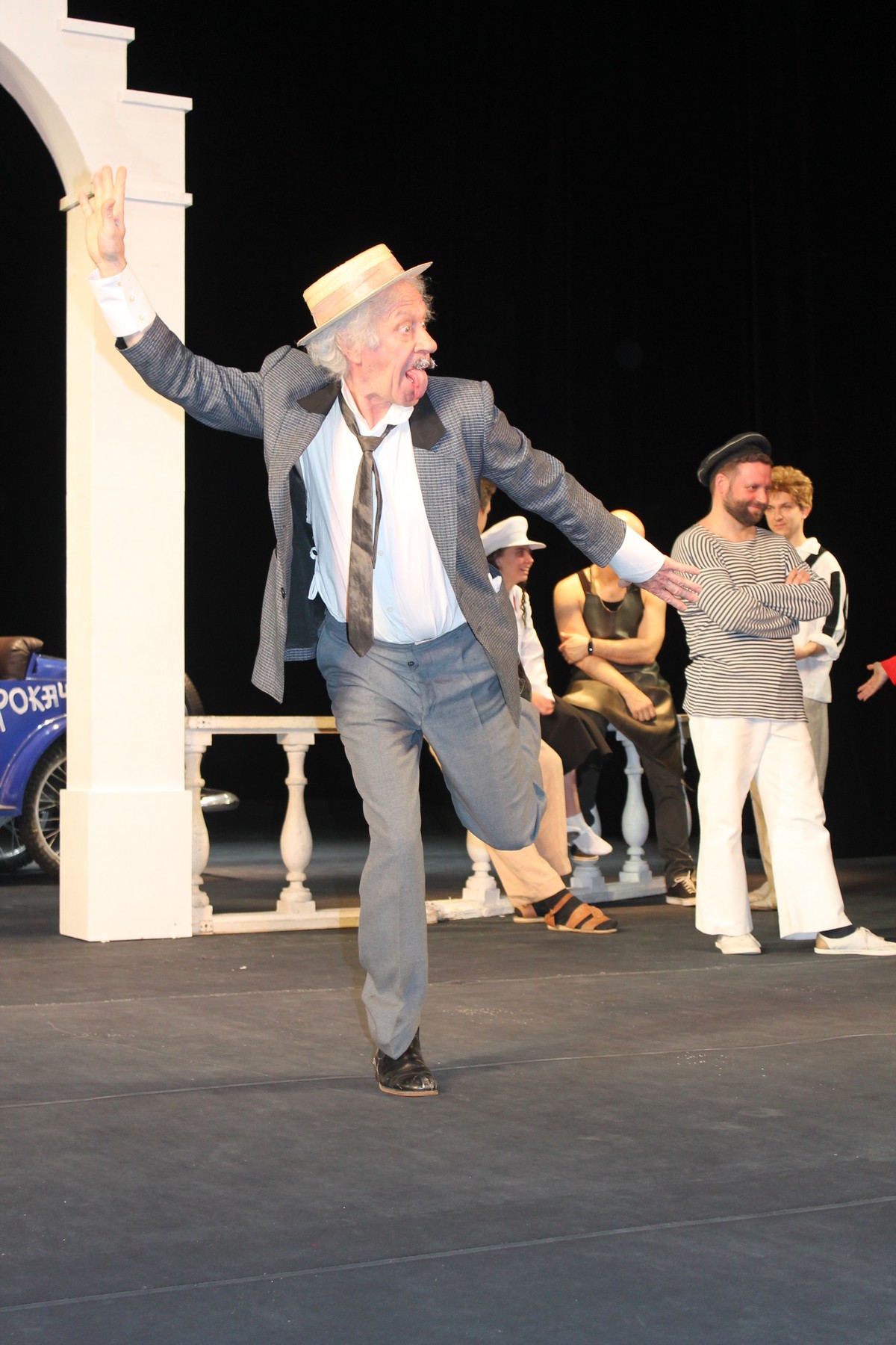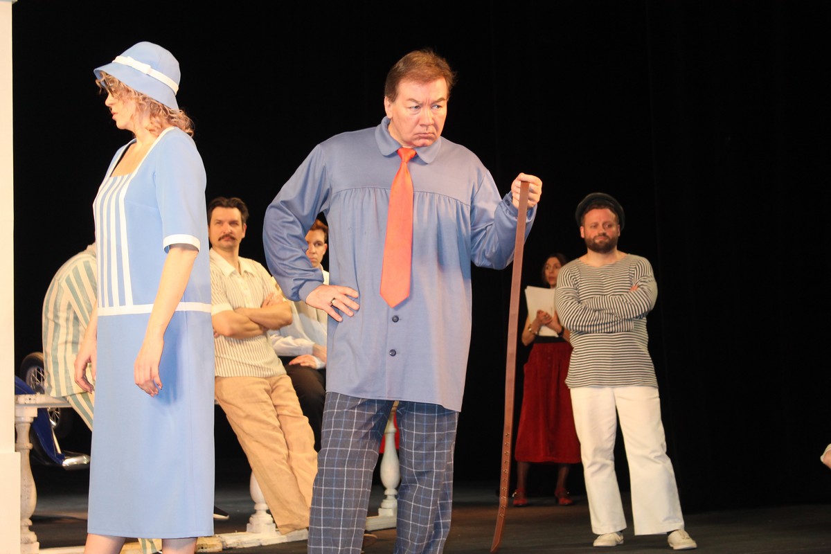 Все занятые в спектакле артисты вышли на сцену и встали на фоне колонны и специально отреставрированного синего ретроавтомобиля. Режиссёр и художник просили их очереди подойти поближе, на авансцену, повернуться, делали замечания по костюму.