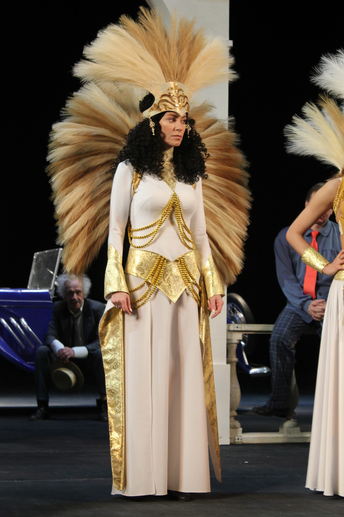 Костюмы интересные, образы получились яркие. У Дмитрия Трифонова – юбка из газеты, у Дмитрия Казанцева из газеты веер, у Анны Сорокиной шикарный белый с золотом костюм с перьями, в нём она похожа на царицу Клеопатру.