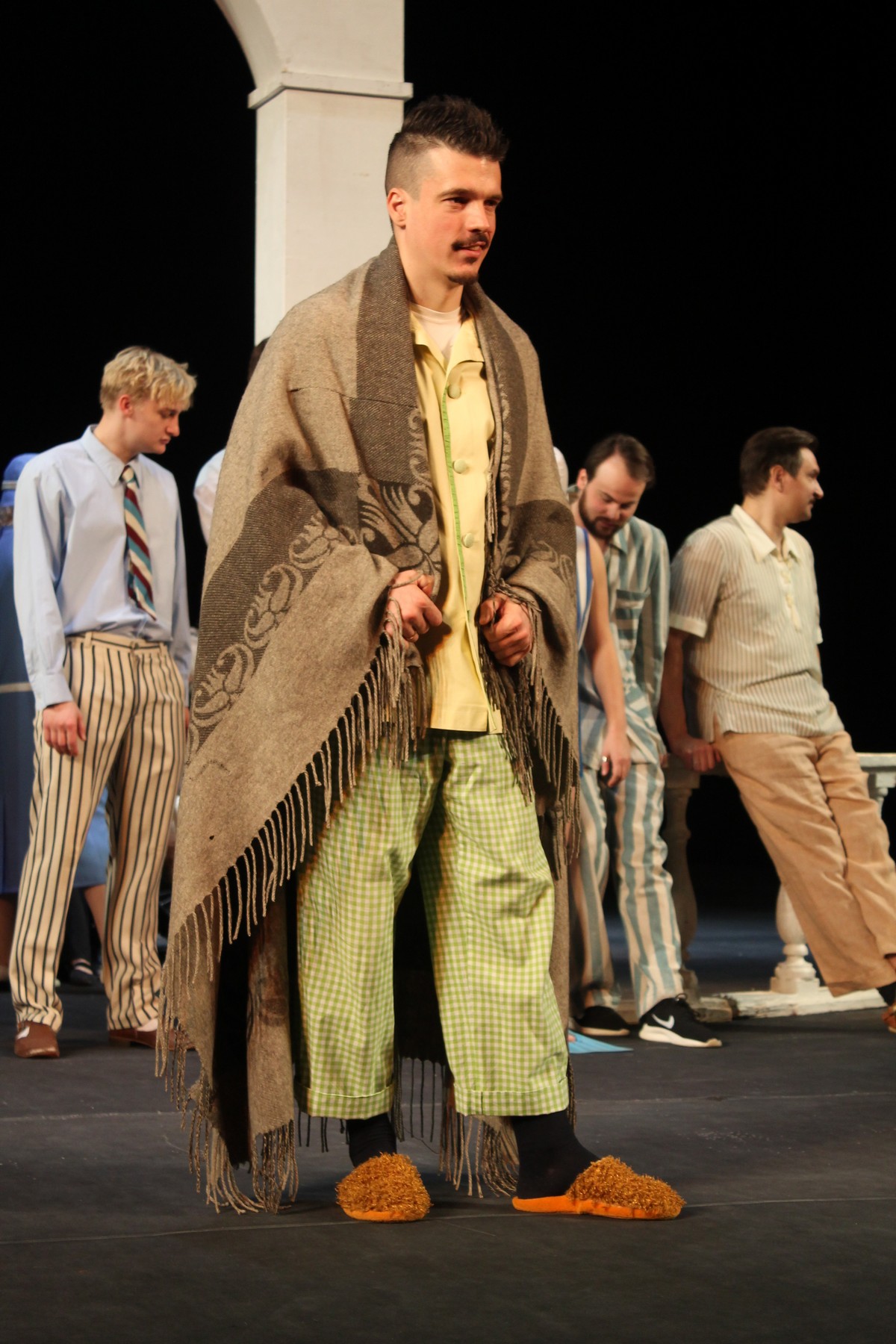 Владимир Пудников в фартуке смахивает на мясника. Фартук решили заменить. Ярослава Орляченко обули в тапочки, Елену Короткову – в ласты, с Сергея Вихрева сняли ремень. А ещё в спектакле будут девушки в противогазах.