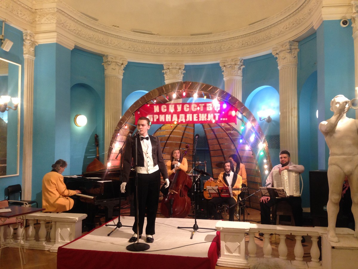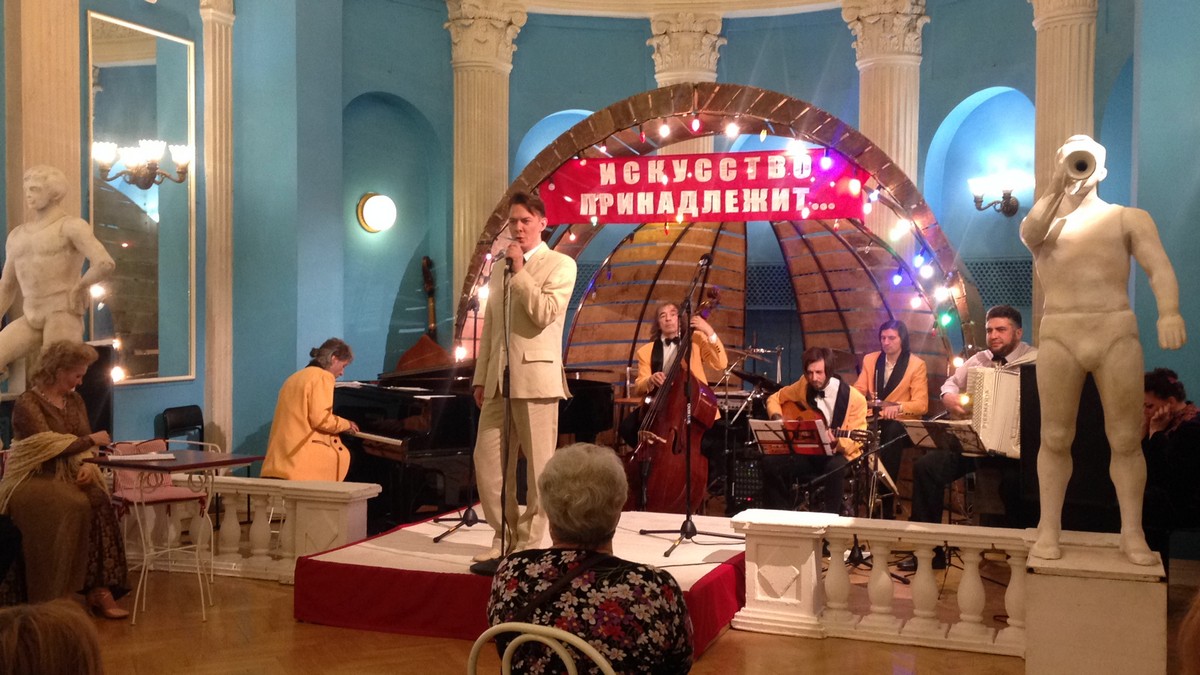 Входя в театр, зрители раздевались в гардеробе, поднимались по ступенькам на второй этаж и оказывались на концертной площадке 1930-х годов ХХ века. Зеркальное фойе в этот вечер стало летней эстрадной площадкой.