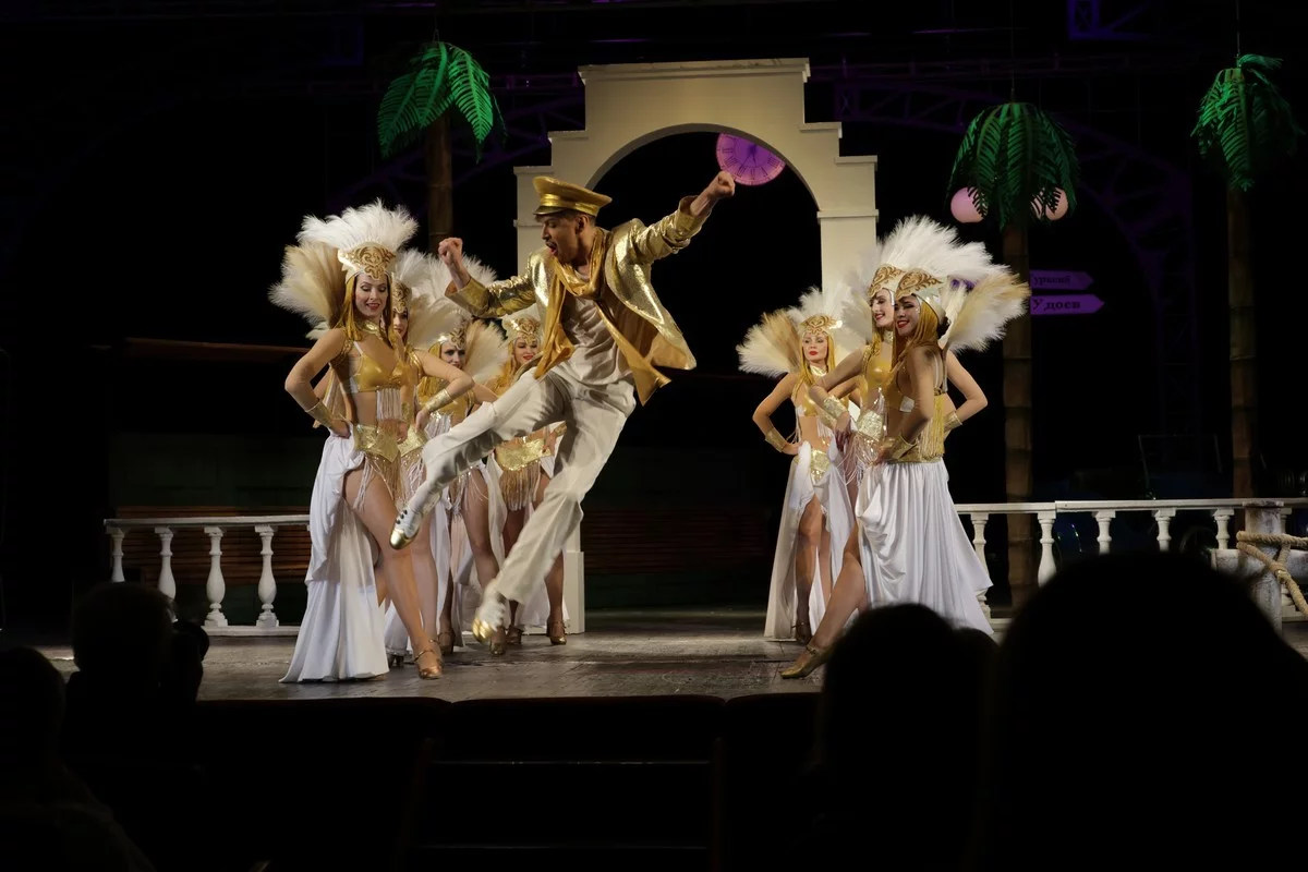 Танцовщицы в бело-золотых карнавальных костюмах с перьями и крыльями эффектно перемещались на сцене. С ними в заветных белых штанах, золотом пиджаке танцевал танго сын турецкоподданного.