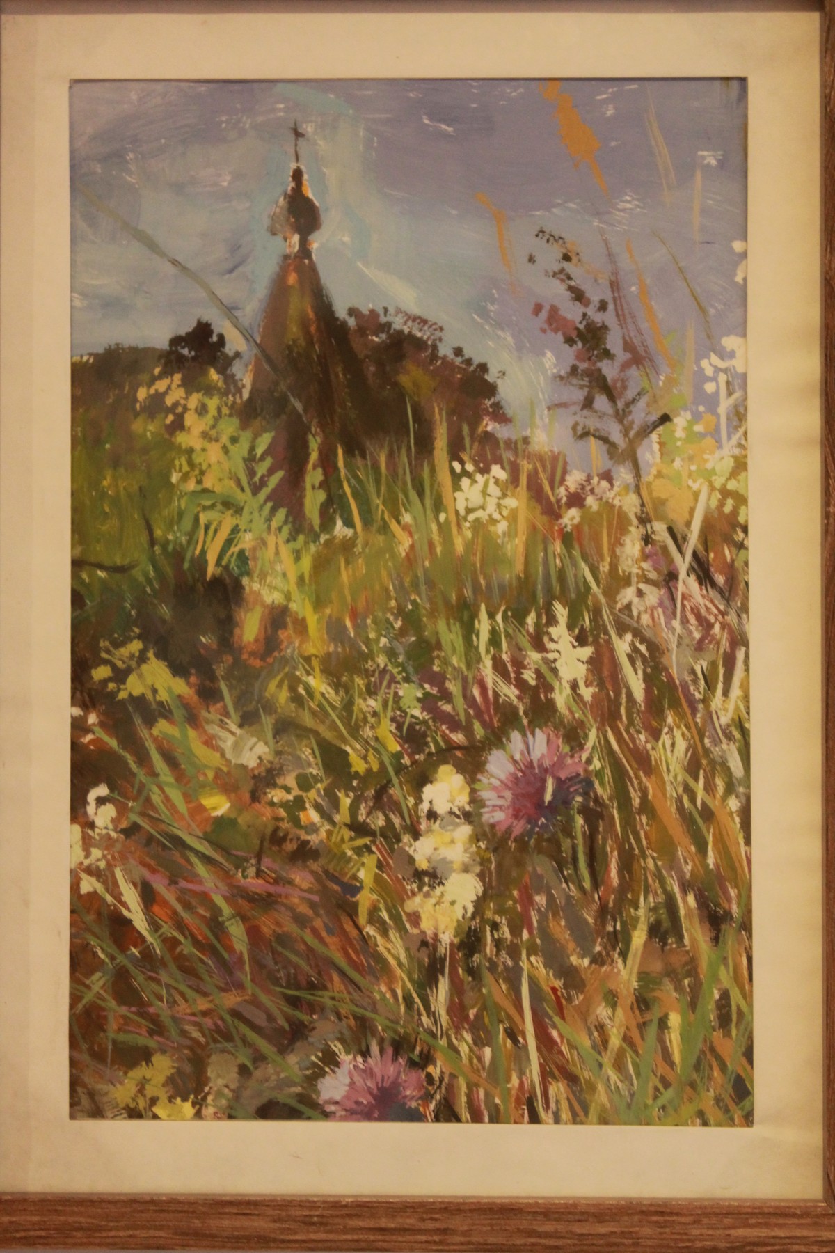 - То, что вы видите на выставке - это эскизы, не масштабное произведение, - говорит Ирина. – Когда мы выезжаем в окрестности города, у меня постоянно возникает желание всё фотографировать и с самых необычных ракурсов. Мне надо было присесть, снять снизу, со стороны разнотравья видневшуюся главку церкви, чтобы потом её написать.