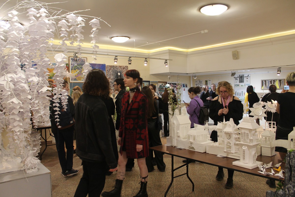 В апреле галерея Дома музыки традиционно превращается в иные миры. Креативные студенты – будущие дизайнеры из бумаги, зеркал, деревянных реек, эпоксидной смолы, ниток и гвоздей создают сюжетные и абстрактные экспонаты. И это всегда весёлый эксперимент.
