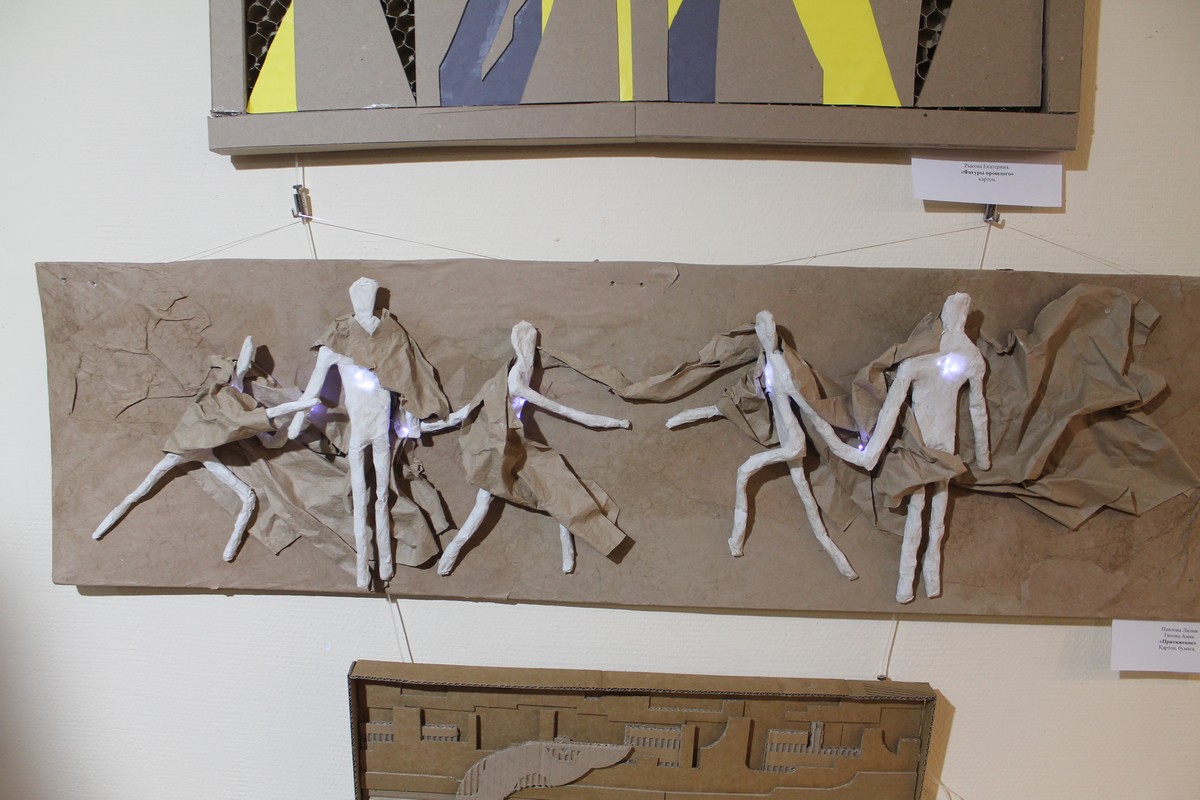 За основу взяли тему «Путешествия Алисы» Кира Булычёва. Экспонаты добрые, позитивные. Есть фотозона с бумажными цветами, кубы, пирамиды, панно. Ребятам интересно увидеть и результат своего творчества, и творчество своих сверстников.