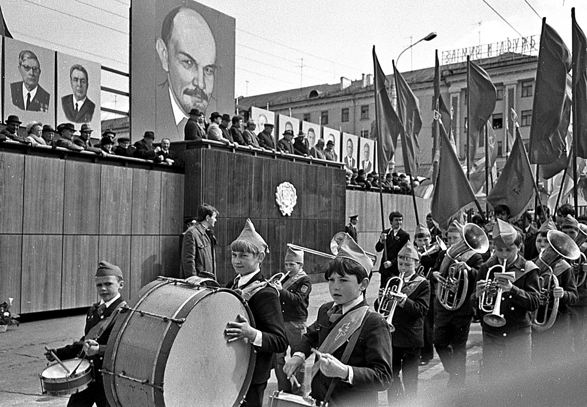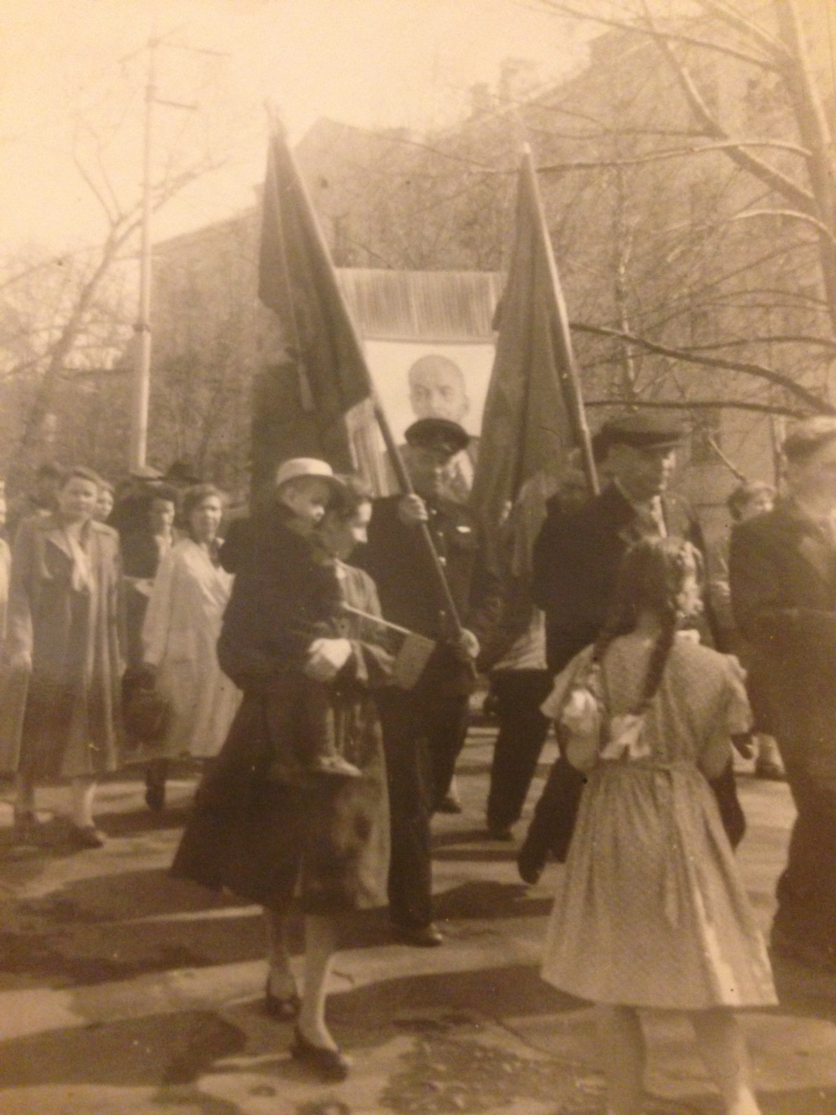 Демонстрация в 1950-1960-х годах была более простая - с портретами вождей и знамёнами.