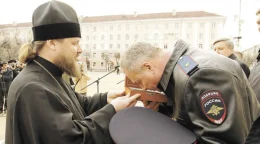 На Театральной площади традиционный строевой смотр стражей порядка начался с передачи иконы святого апостола Андрея Первозванного и ковчега с мощами святых божиих угодников.