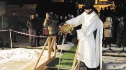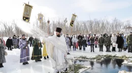 Иордани покрыты тоненькой корочкой льда. Батюшки чинно совершают обряд освящения купелей. Верующие крестятся.