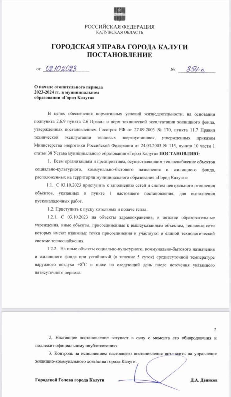 Отопительный сезон в Калуге начнется с 3 октября. Соответствующее постановление в понедельник подписал городской голова Дмитрий Денисов.