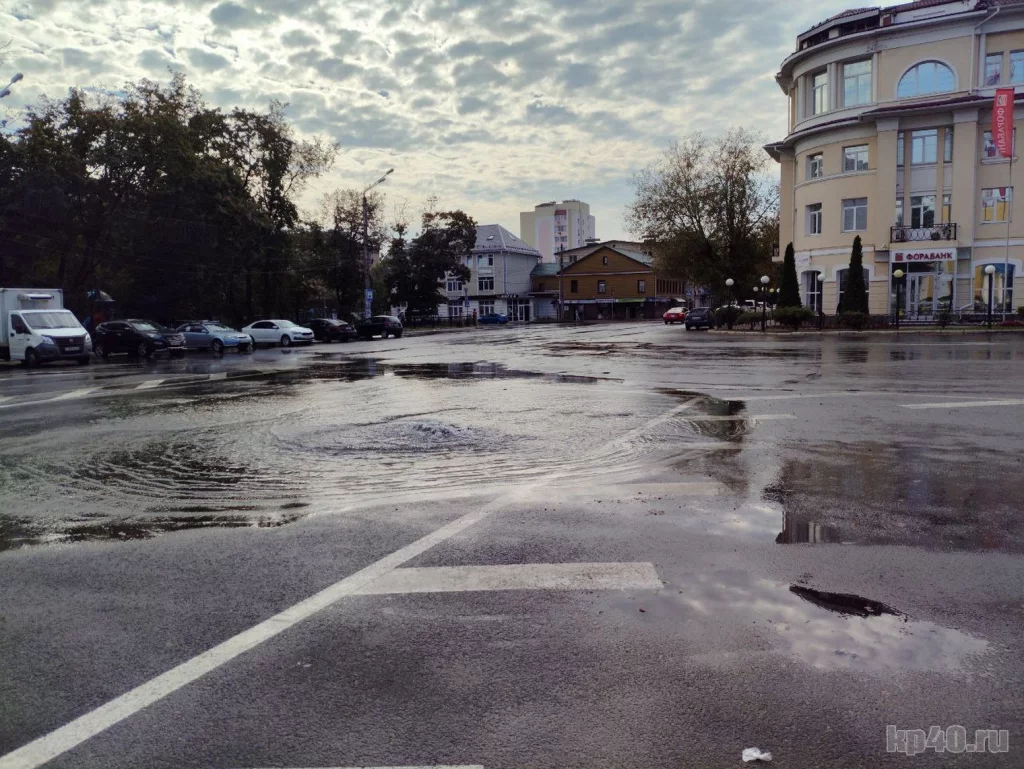 Вода быстрыми потоками вырывается из канализационного колодца и растекается по всем окрестным улицам.