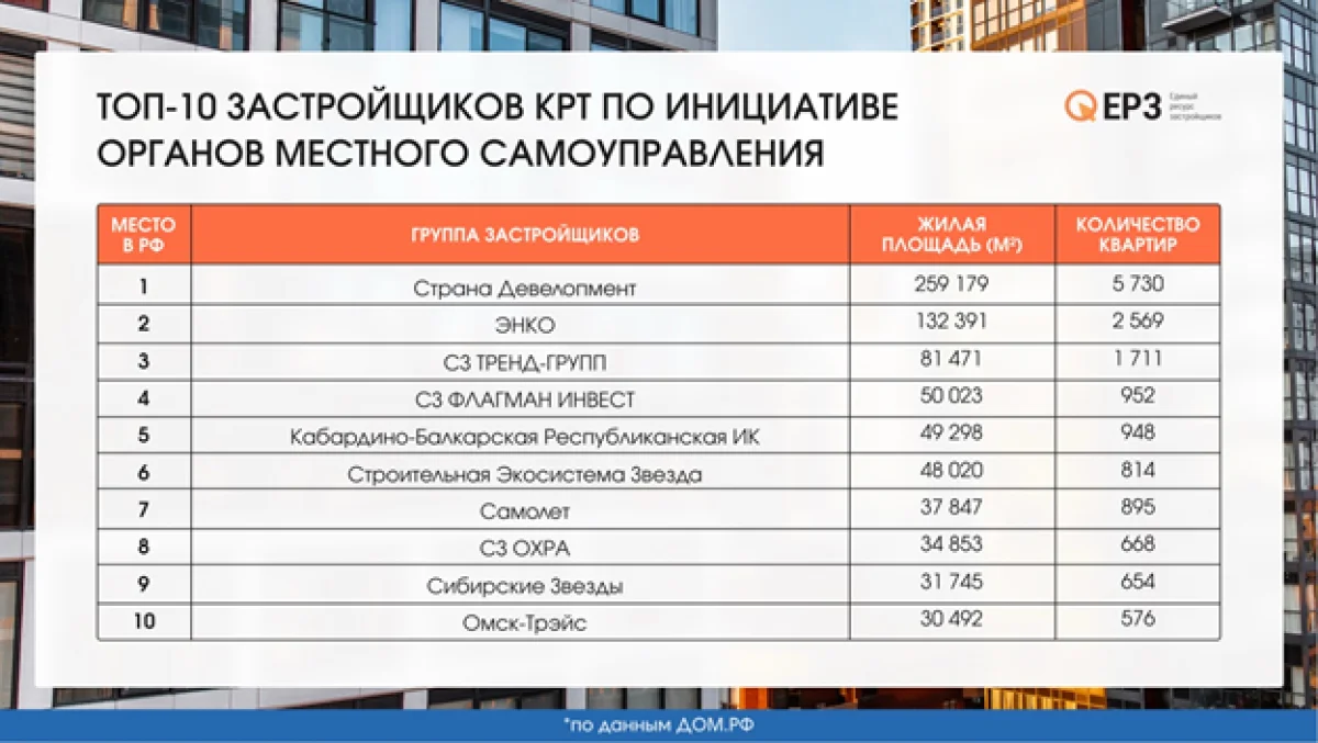 ТОП ЗАСТРОЙЩИКОВ КРТ по инициативе органов местного самоуправления