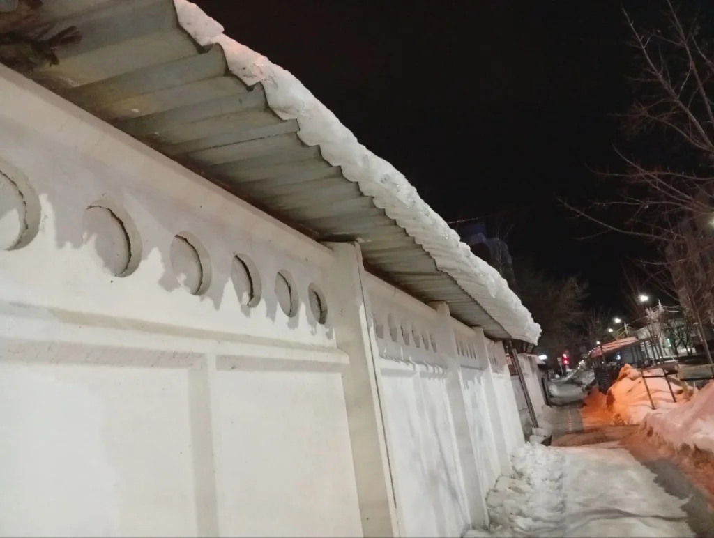 Снежная глыба медленно сползает на тротуар в районе дома №6 на улице Чижевского.