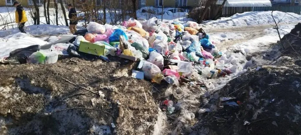 Проход к контейнерам долгое время был завален снегом, поэтому люди бросали пакеты в кучу.