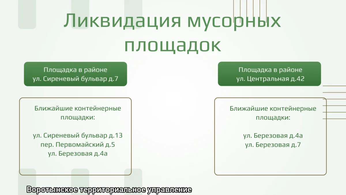 В связи с ликвидацией контейнерных площадок в районе домов по ул. Сиреневый бульвар д. 7 и ул. Центральная д. 42 запрещено складировать мусор на данной территории, - говорится в официальном комментарии.
