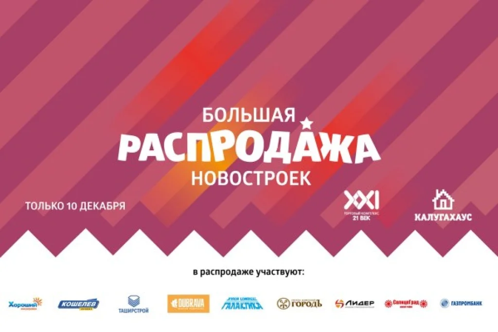 Завтра и только завтра, 10 декабря, в Торговом комплексе 21 век пройдет первая большая распродажа новостроек, организованная проектом «Калугахаус». Свои тайные новогодние предложения (в основном, большие скидки на некоторые квартиры) покажут 8 ведущих калужских застройщиков и один банк. Выбрать квартиру по супер-цене можно будет в любом районе города! Распродажа начнется в 11-00, а в 18-00 завершится вручением премии «Лидеры рынка недвижимости — 2016». Кроме интересных предложений, гостей ТК 21 век ждет мастер-класс по росписи новогодних пряников и зажигательный ведущий.