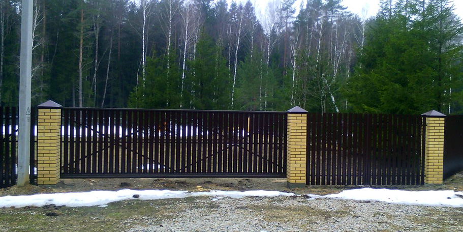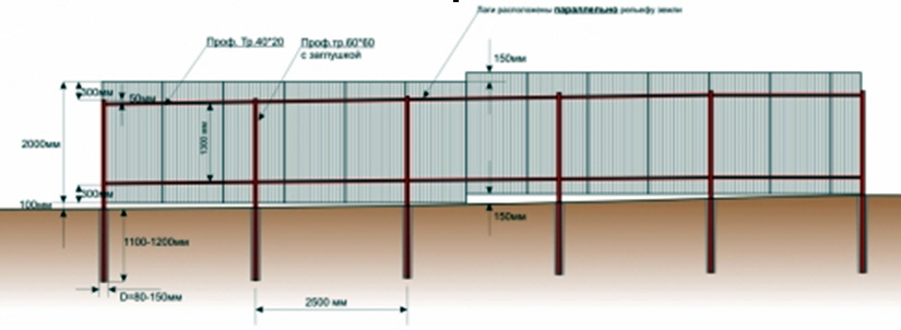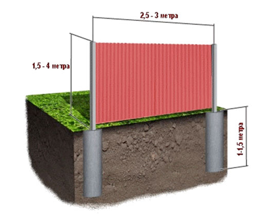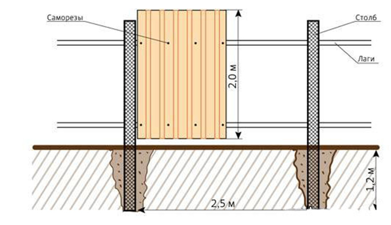 Столбы. Металлическая профильная труба квадратного или прямоугольного сечения 40х60 или 60х60 и толщиной стенок от двух миллиметров. Расстояние между опорами – 2-2,5 метра. В глинистой почве заглубляют столбы на 80-90 см, если почва песчаная или присутствуют высокие грунтовые воды, то минимальное углубление для опор составляет 100-120 см.