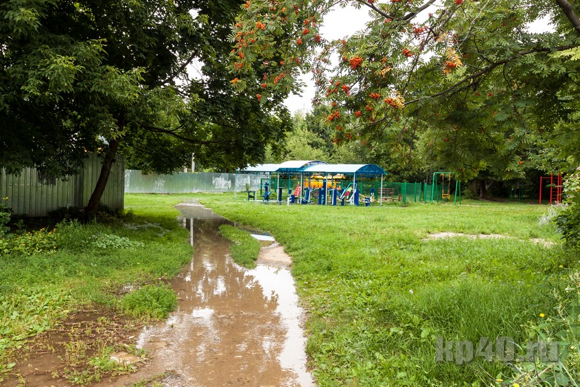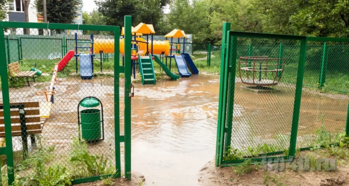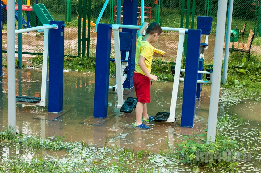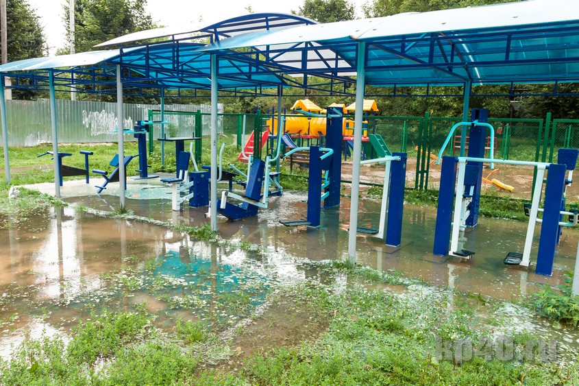 Детская площадка и тренажерный комплекс оказались залиты. Кажется, что ещё немного и вода доберётся до подъездов.