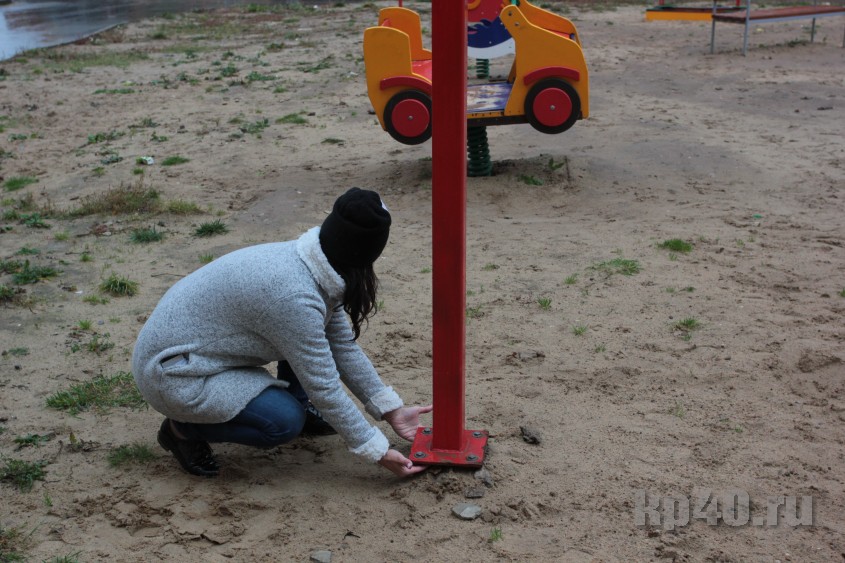 Детская площадка установлена под наклоном, ничем не огорожена. Дети то и дело выскакивают на дорогу.