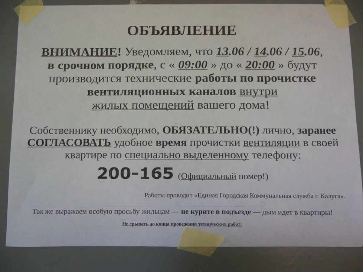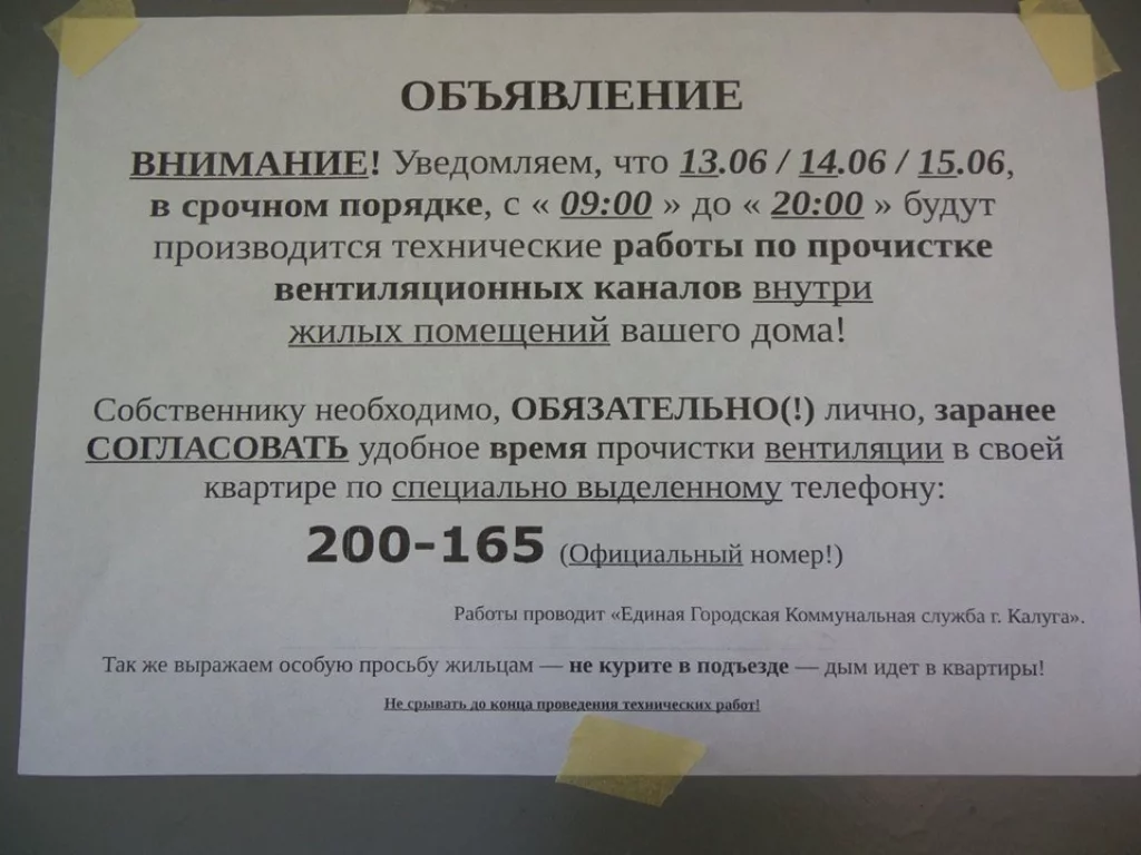 Во многих домах Калуги в последнее время начали появляться объявления о запланированных работах якобы от имени коммунальных служб. Однако такой организации не существует, сообщили 25 июня в городской управе Калуги.
