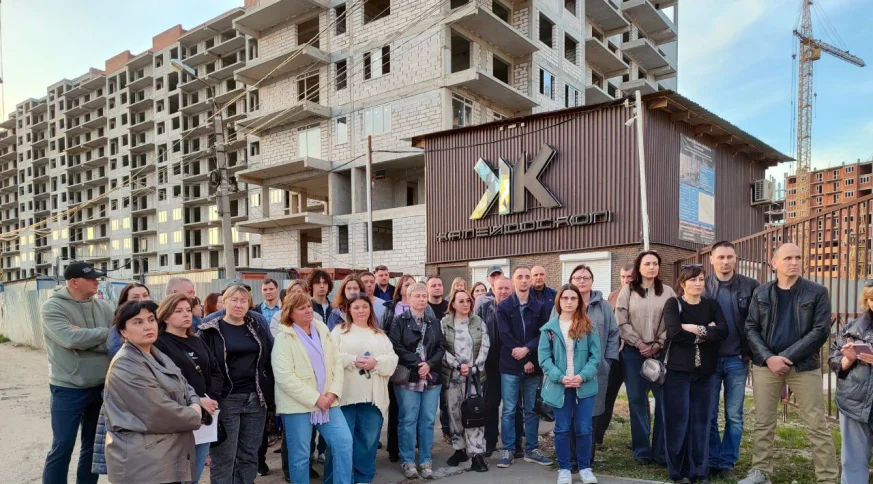Десятки калужан в среду, 16 апреля 2025 года, практически перекрыли дорогу в переулке Баррикад у закрытых дверей офиса продаж ЖК «Калейдоскоп».