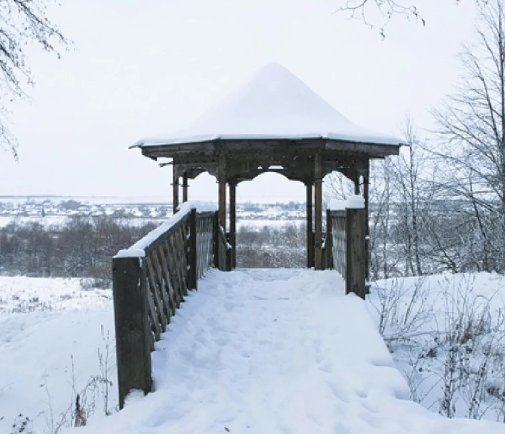 - Восстановленную часть усадебной ограды с въездными воротами и деревянные беседки с мостиком в парке.