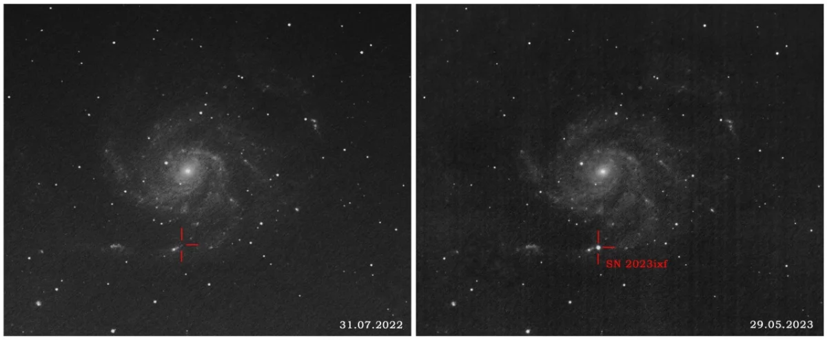 В галактике М101 «Вертушка», удаленной от Земли на 21 миллион световых лет, в созвездии Большой Медведицы вспыхнула сверхновая звезда SN 2023ixf. Первым ее обнаружил японский астроном-любитель Коити Итагаки. 29 мая звезду также наблюдали сотрудники астрономической обсерватории, сообщили нам в музее космонавтики.
