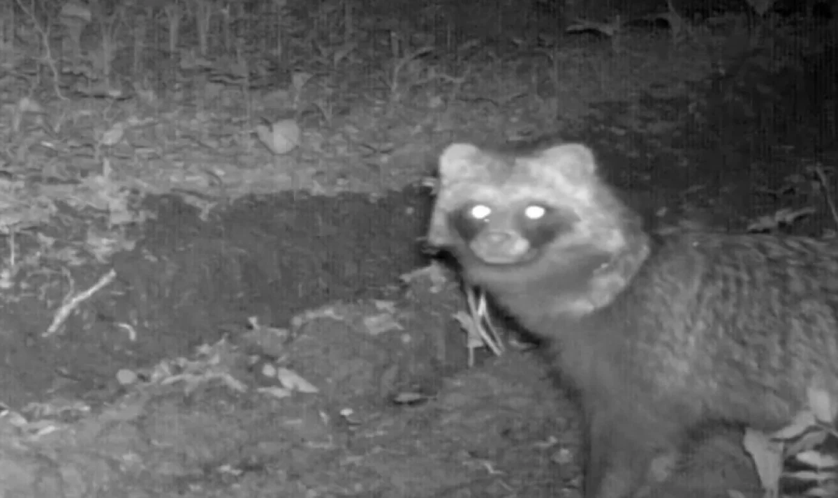 В калужском лесу енотовидная собака попала в фотоловушку