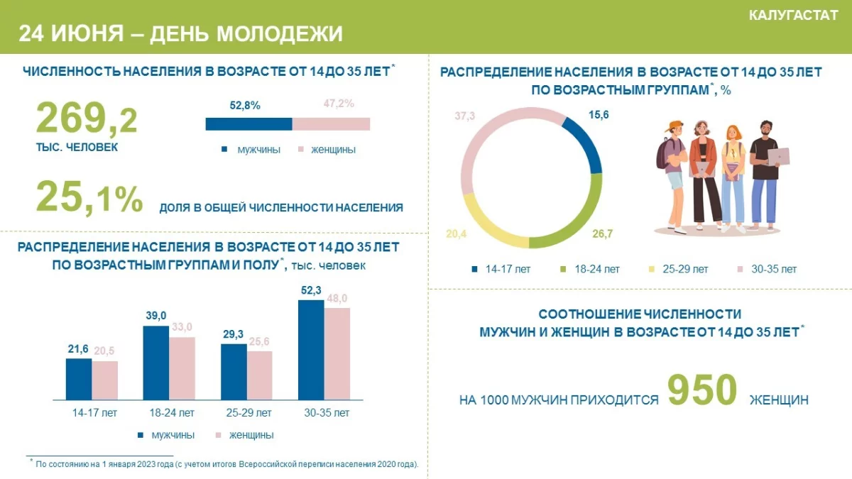 На начало 2023 года численность молодежи в Калужской области составила 269,2 тысячи человек. Среди них 142 тысячи мужчин и 127 тысяч женщин. Доля молодого населения в общей численности региона составила 25,1%.