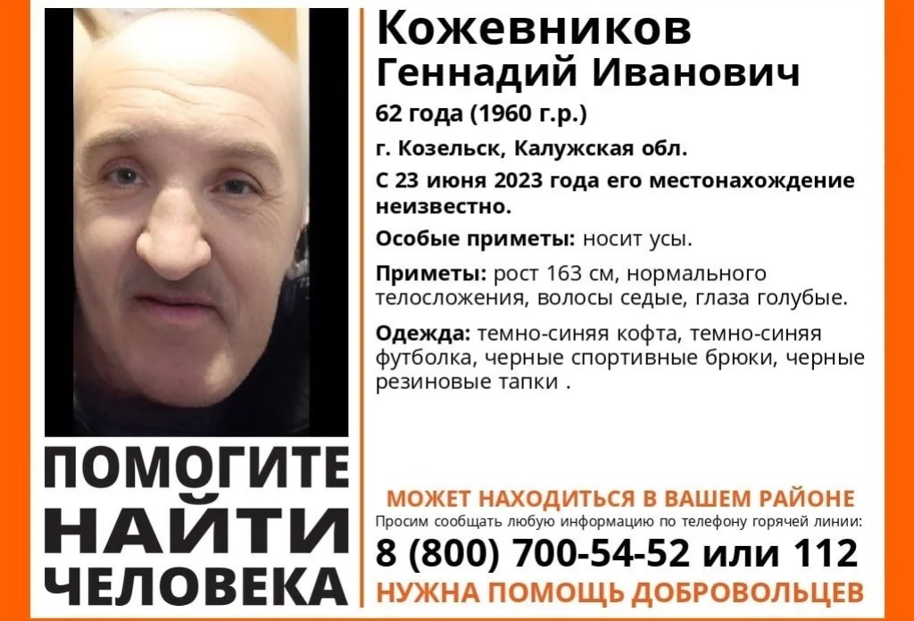 Пропал Кожевников Геннадий Иванович, 62 года, город Козельск, Калужская область.
