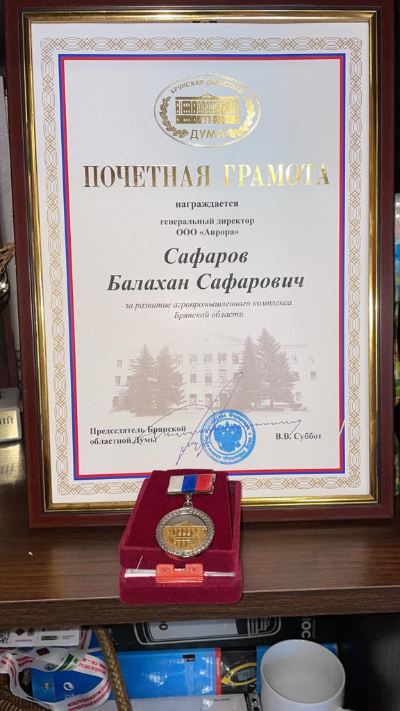 Непрерывное развитие и честный, упорный труд ООО «Аврора» был неоднократно отмечен на разных уровнях. Так, недавно Балахан Сафарович получил почетную грамоту и медаль-знак Брянской областной Думы за развитие агропромышленного комплекса Брянской области лично из рук губернатора Александра Васильевича Богомаза. Труд работников предприятия тоже отмечен грамотами, которые им вручал председатель профсоюза Калужской области.