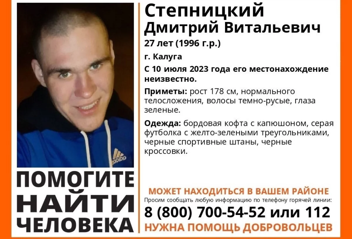 В субботу, 15 июля, поисково-спасательный отряд «Лиза Алерт» сообщил о поисках 27-летнего Дмитрия Степницкого из Калуги.