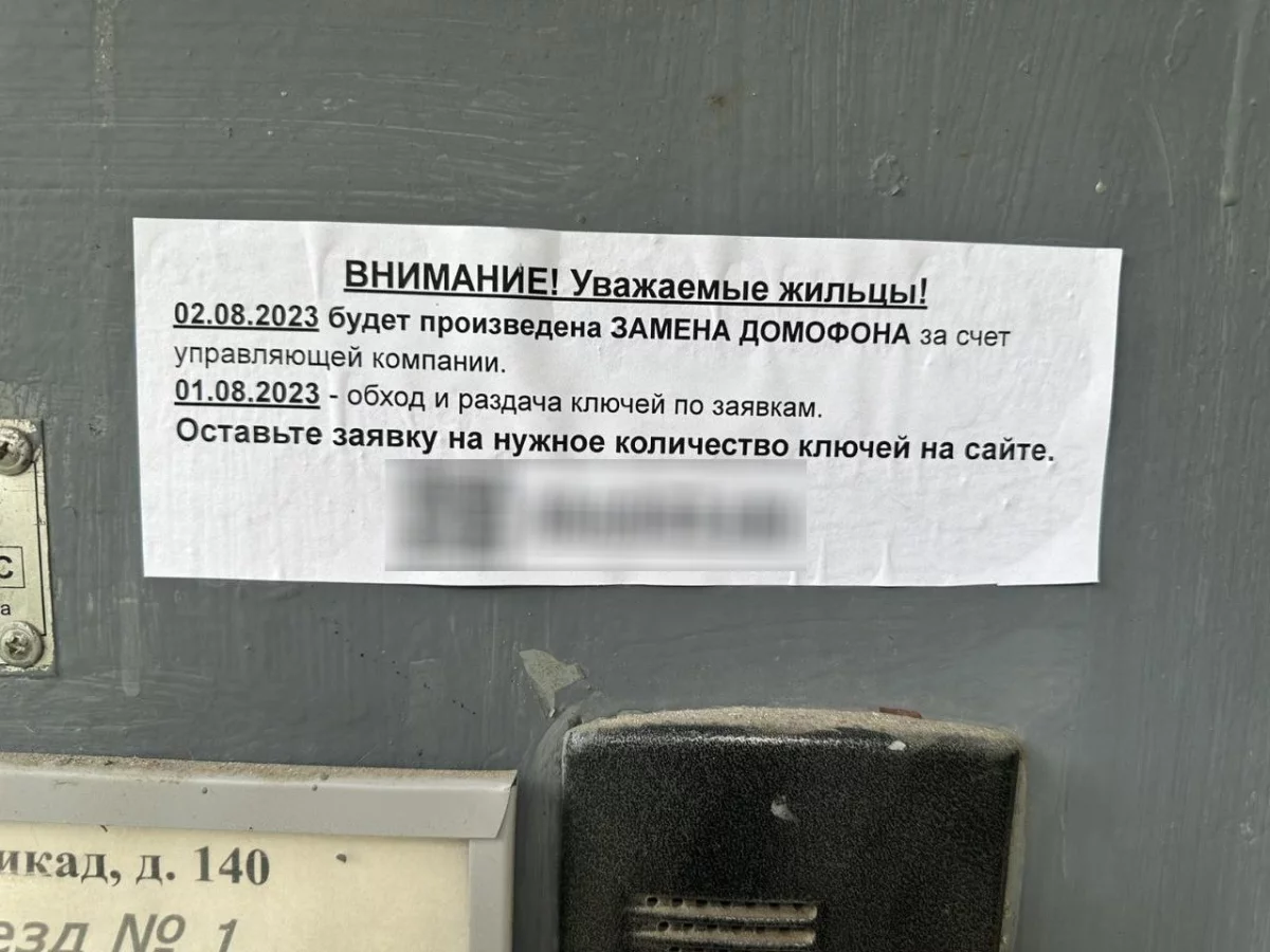 Женщина рассказала, что жители улиц Маршала Жукова, Фридриха Энгельса, Баррикад жалуются на объявления, расклеенные на дверях их подъездов, в которых содержится информация о замене домофона, а также предложение о замене ключей.
