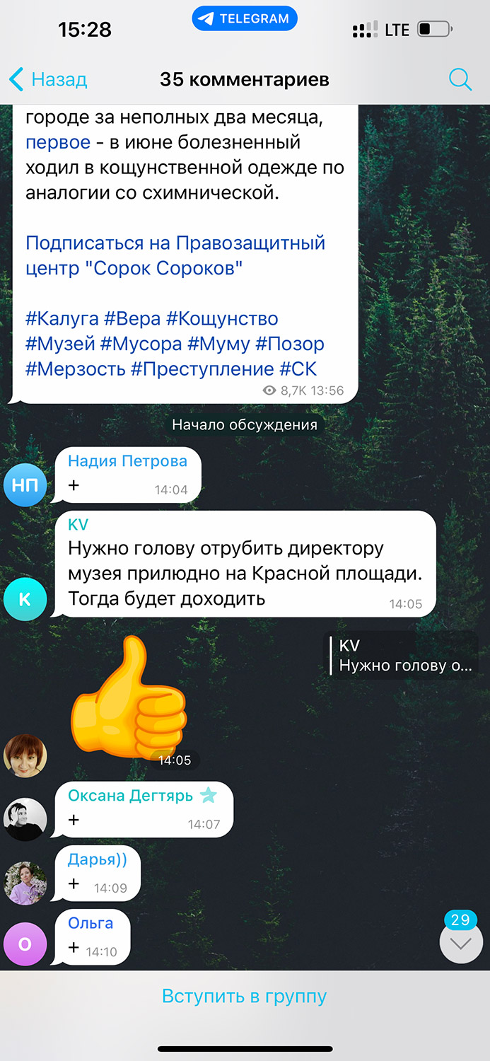 Некоторые участники движения предлагают отрубить руку или голову директору музея, кто-то упоминает, что есть табу, которые не стоит переступать, также вспомнили, что при Сталине за такое делали «укорот».