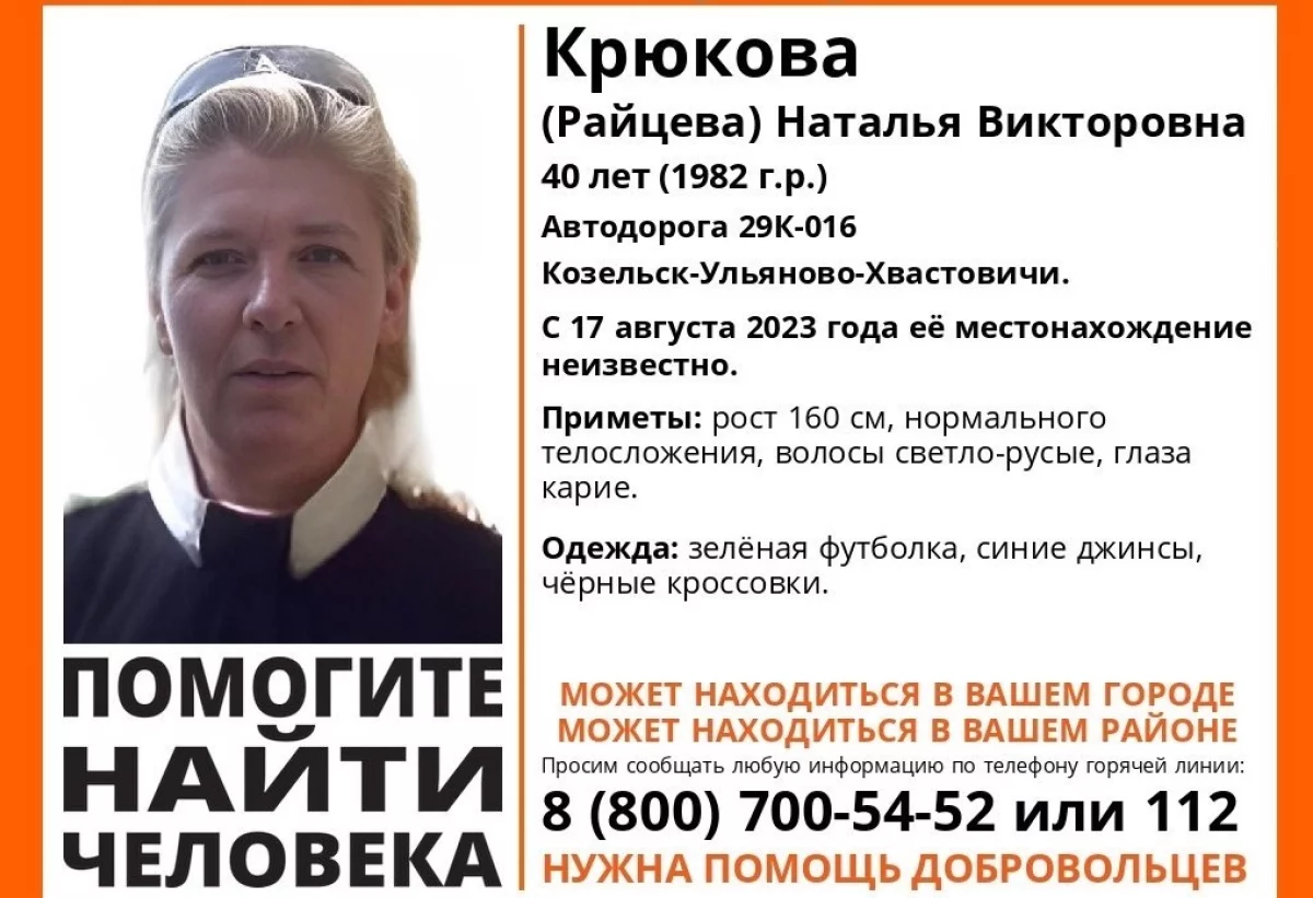 Внимание, помогите найти человека! Пропала Крюкова (Райцева) Наталья Викторовна, 40 лет, автодорога 29К-016 Козельск-Ульяново-Хвастовичи.